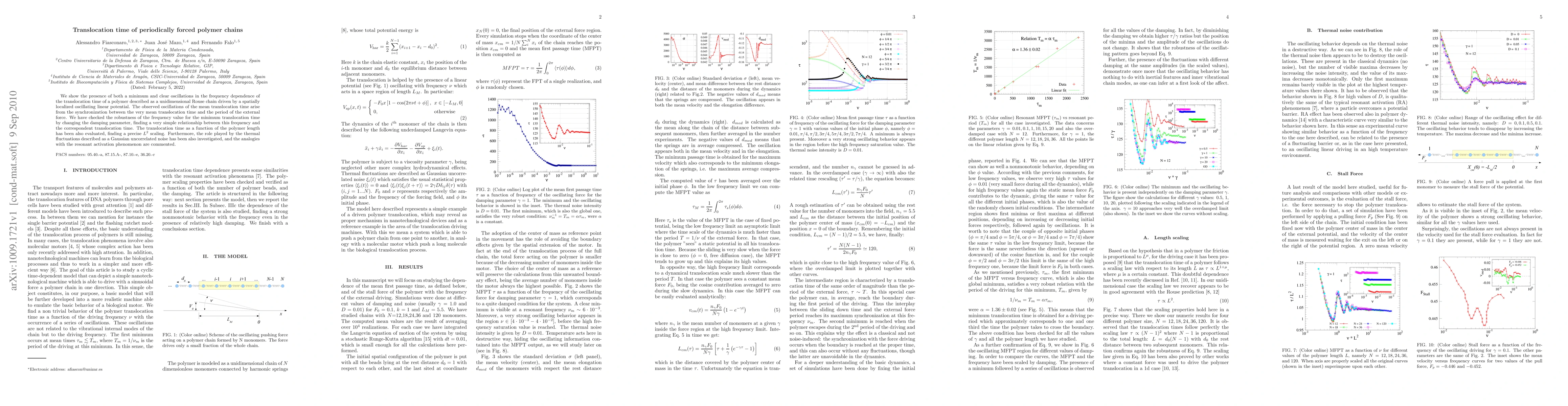 This paper investigates the translocation time of a unidimensional Rouse polymer chain under a periodically forced oscillating potential, revealing oscillations and a minimum translocation time dependent on the driving frequency. The study finds a robust relationship between the frequency of the minimum translocation time and the polymer length, showing a precise $L^2$ scaling.