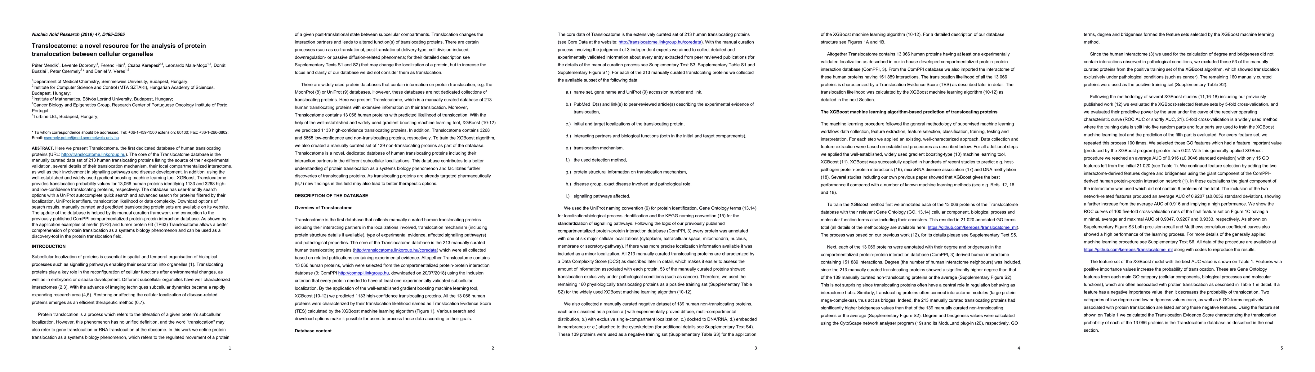 The Translocatome database was constructed using a combination of manual curation and machine learning, specifically the XGBoost algorithm. The manual curation involved a multidisciplinary team assessing 238 papers to curate 213 human translocating proteins, while XGBoost predicted translocation likelihood for approximately 13,000 human proteins.