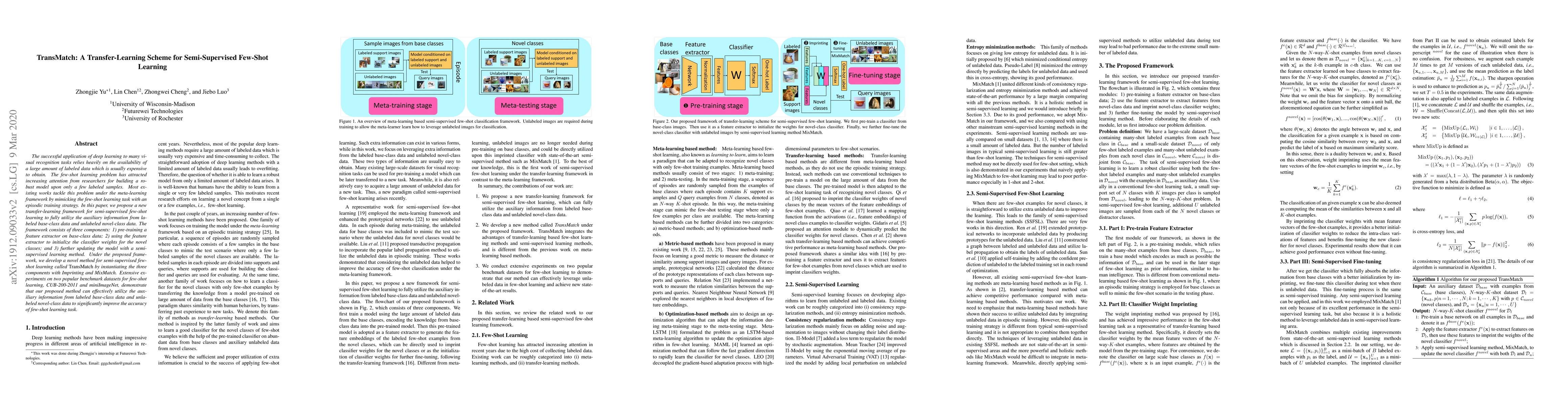 The paper introduces TransMatch, a transfer-learning scheme for semi-supervised few-shot learning that leverages labeled base-class data and unlabeled novel-class data to improve model performance. Experiments on CUB-200-2011 and miniImageNet datasets show significant accuracy gains.