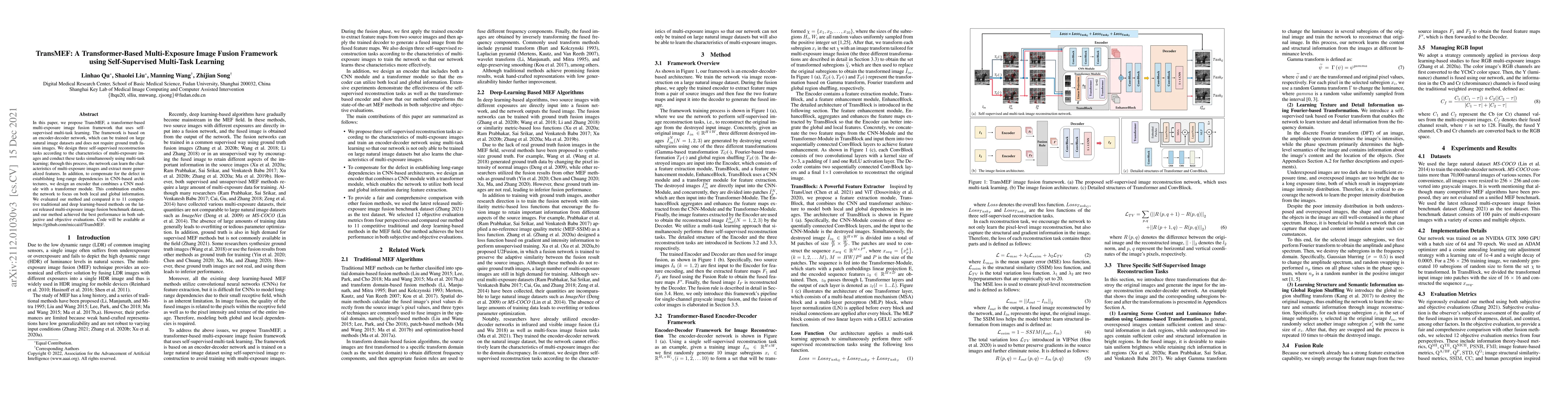 TransMEF, a transformer-based framework for multi-exposure image fusion, utilizes self-supervised multi-task learning without ground truth data. It combines CNN and transformer modules to capture both local and global image features, outperforming 11 competitors in evaluations.