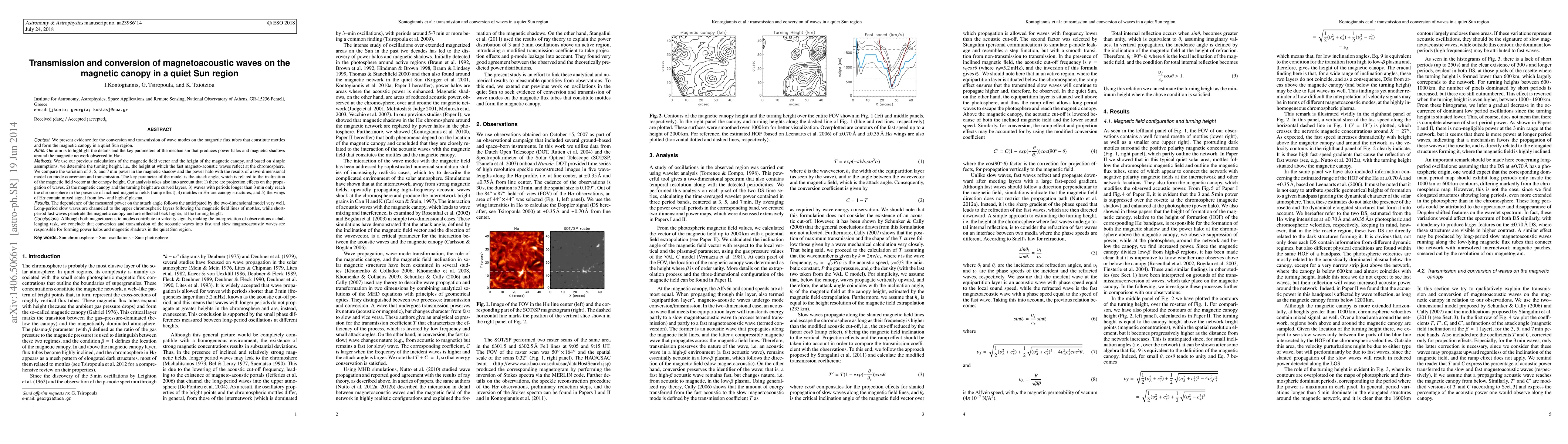 This paper investigates the conversion and transmission of magnetoacoustic waves in the magnetic canopy of a quiet Sun region, demonstrating how these processes generate power halos and magnetic shadows in Hα observations. The study finds that the attack angle, related to the magnetic field inclination, significantly influences wave behavior, with long-period waves channeled along mottles and short-period waves reflecting at the turning height.
