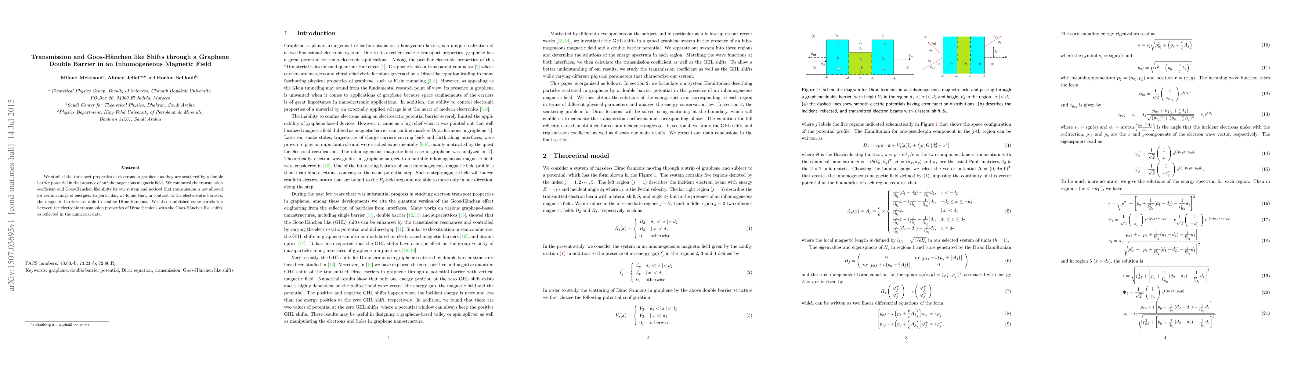 This study investigates electron transport in graphene through a double barrier in an inhomogeneous magnetic field, revealing that transmission is blocked for certain energy ranges. Unlike electrostatic barriers, magnetic barriers can confine Dirac fermions, and a correlation is found between electronic transmission properties and Goos-Hänchen-like shifts.