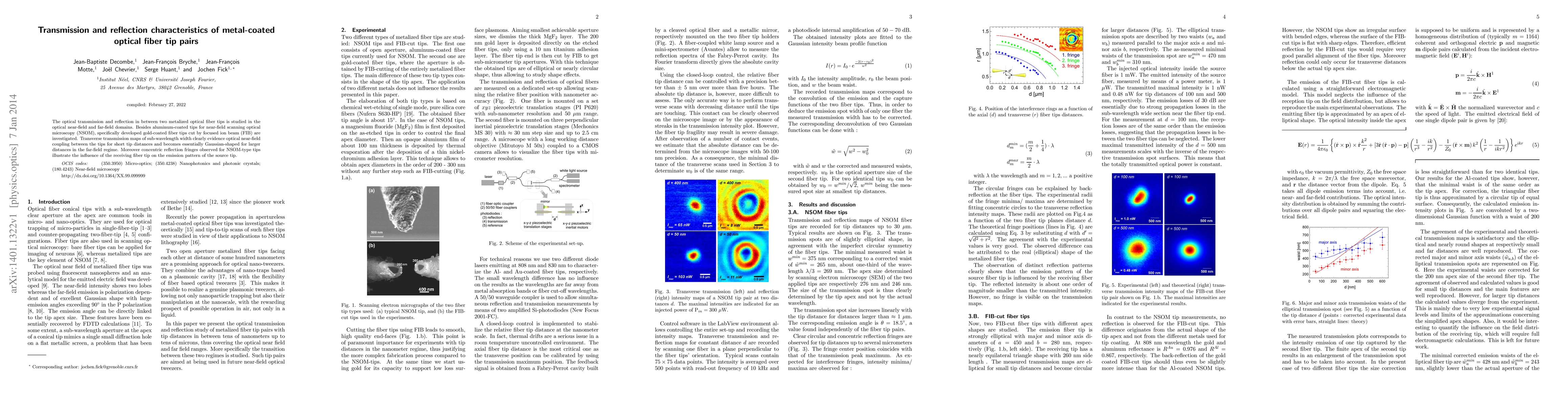 This paper investigates optical transmission and reflection between metal-coated optical fiber tips, revealing near-field coupling and Gaussian-shaped far-field transmission, with concentric reflection fringes indicating the influence of the receiving fiber on the source tip's emission pattern.