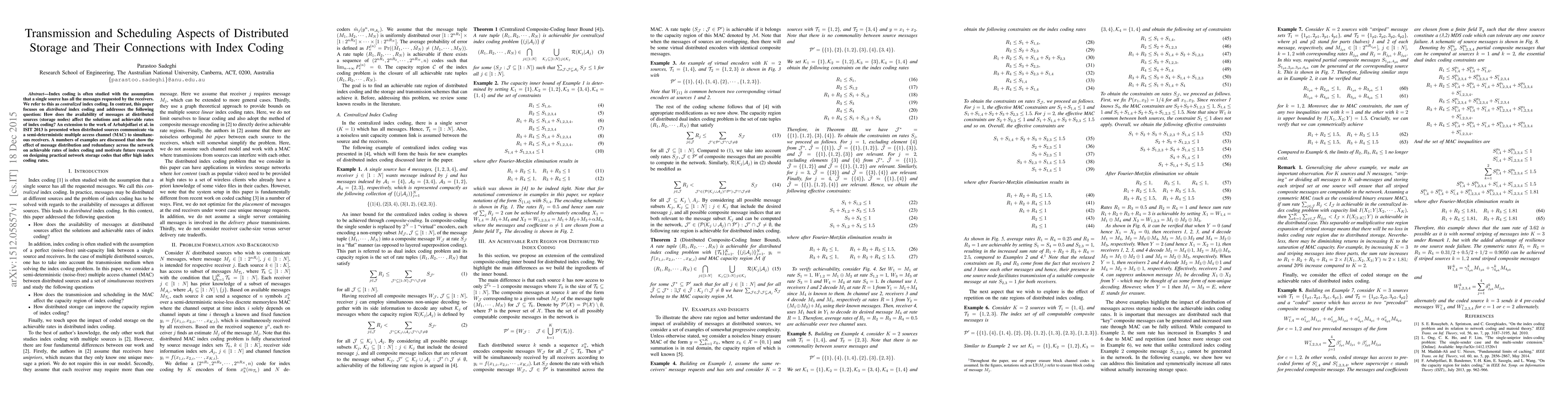 This paper explores distributed index coding where messages are stored across multiple nodes, examining how message distribution impacts achievable rates. It extends previous work by considering a semi-deterministic multiple access channel, providing examples that highlight the effects of network redundancy and message distribution on index coding performance.