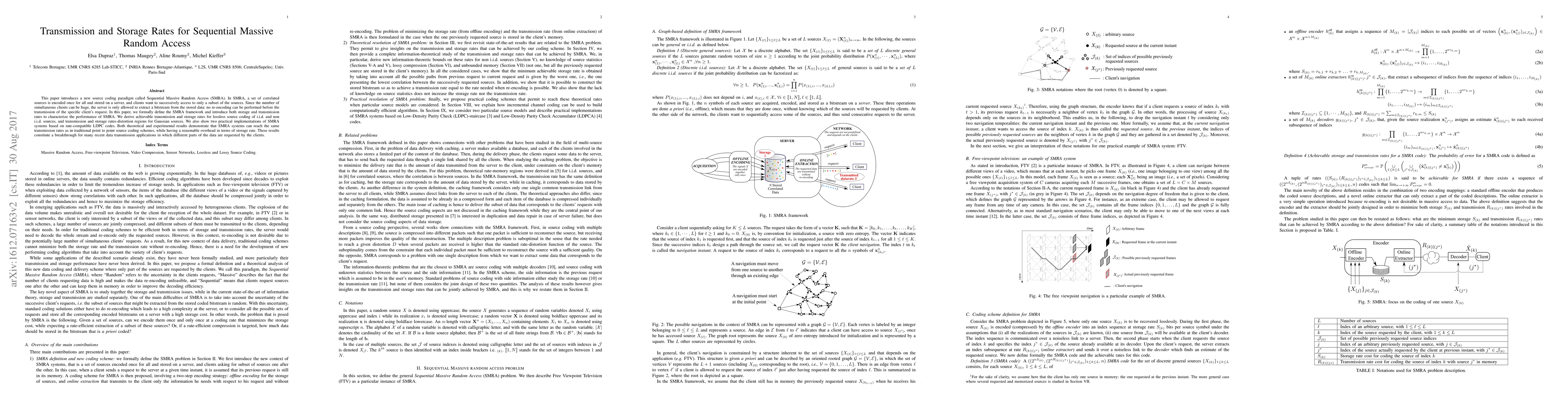 This paper introduces a new source coding paradigm called Sequential Massive Random Access (SMRA). In SMRA, a set of correlated sources is encoded once for all and stored on a server, and clients want to successively access to only a subset of the sources. Since the number of simultaneous clients can be huge, the server is only allowed to extract a bitstream from the stored data: no re-encoding can be performed before the transmission of the specific client's request. In this paper, we formally define the SMRA framework and introduce both storage and transmission rates to characterize the performance of SMRA. We derive achievable transmission and storage rates for lossless source coding of i.i.d. and non i.i.d. sources, and transmission and storage rates-distortion regions for Gaussian sources. We also show two practical implementations of SMRA systems based on rate-compatible LDPC codes. Both theoretical and experimental results demonstrate that SMRA systems can reach the same transmission rates as in traditional point to point source coding schemes, while having a reasonable overhead in terms of storage rate. These results constitute a breakthrough for many recent data transmission applications in which different parts of the data are requested by the clients.