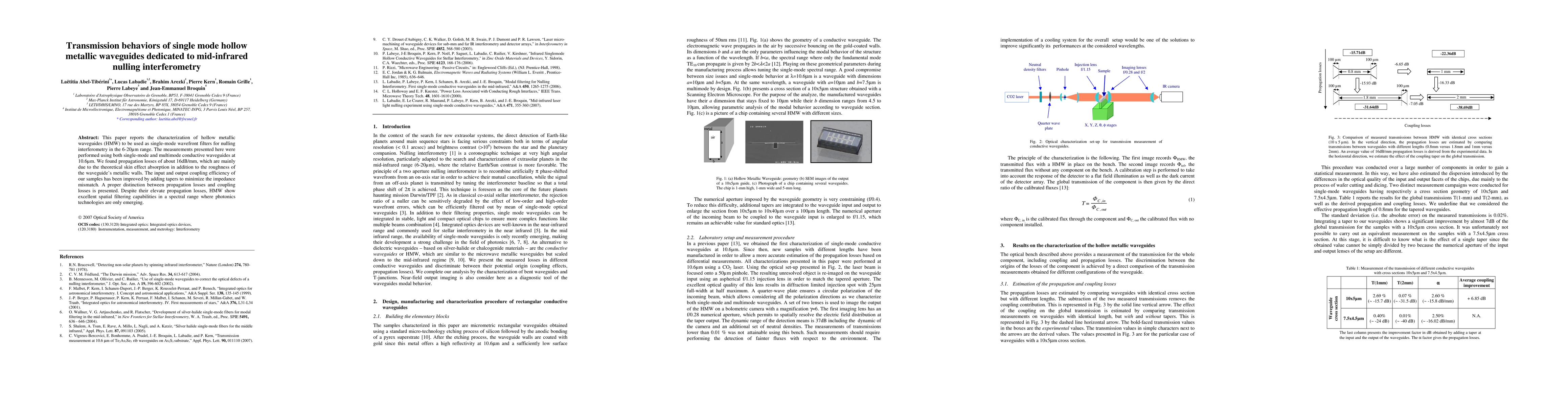 This paper characterizes hollow metallic waveguides for single-mode wavefront filters in mid-infrared nulling interferometry, reporting propagation losses of 16dB/mm due to skin effect absorption and metallic wall roughness. Improved coupling efficiency is achieved through tapers, highlighting their potential despite high losses.