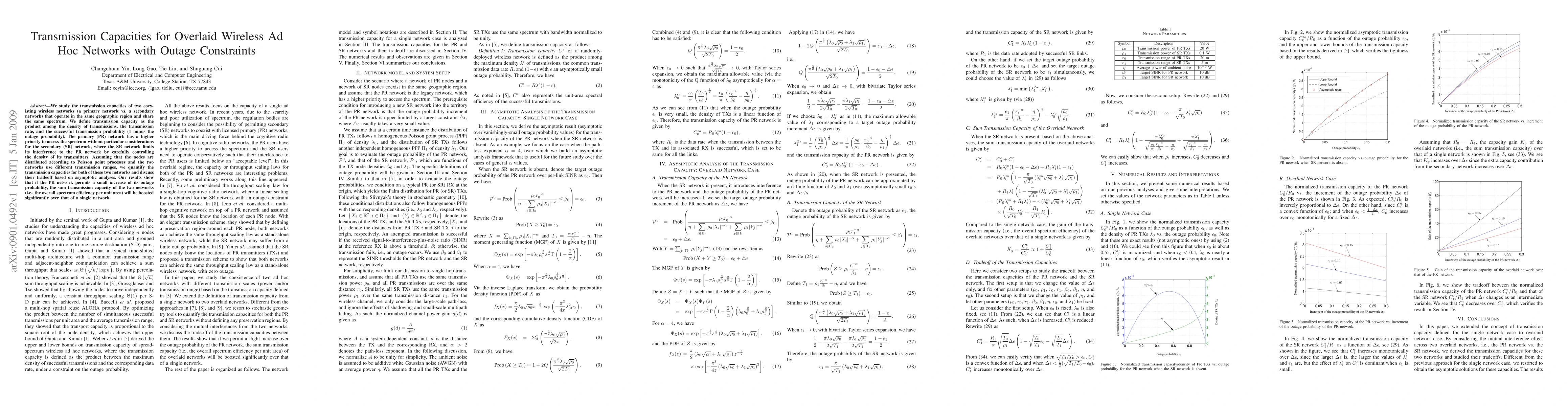This paper investigates the transmission capacities of two overlaid wireless ad hoc networks sharing the same spectrum, with the primary network having higher priority. It finds that allowing a slight increase in the primary network's outage probability can significantly boost the overall spectrum efficiency by increasing the sum transmission capacity of both networks.