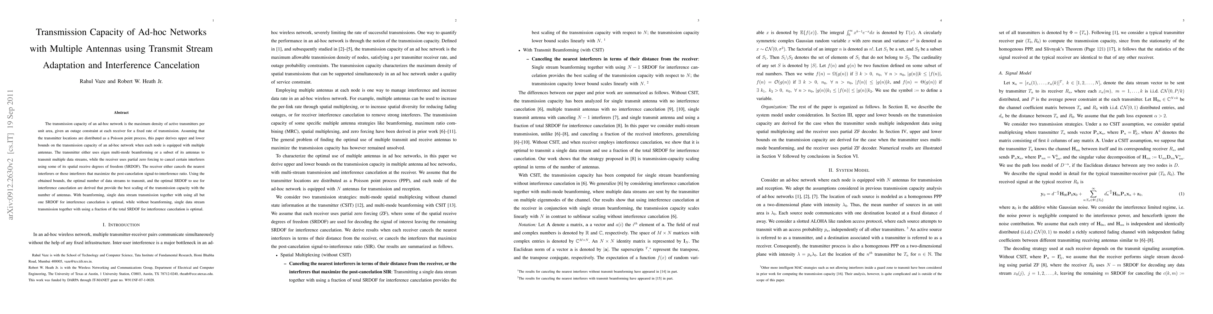 This paper derives bounds on the transmission capacity of ad-hoc networks with multiple antennas, considering beamforming and interference cancelation. The study finds that optimal strategies depend on whether beamforming is used, with single data stream transmission and partial interference cancelation providing the best capacity scaling.