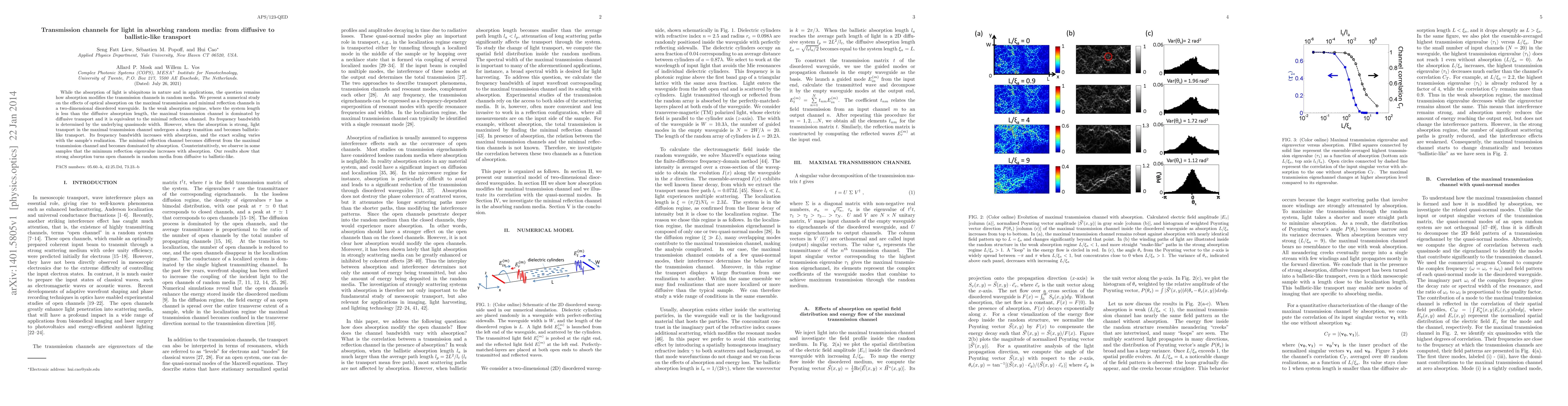 This paper investigates how optical absorption influences light transmission in two-dimensional disordered waveguides, finding that weak absorption leads to diffusive transport, while strong absorption induces a transition to ballistic-like transport, altering the minimal reflection channel and sometimes increasing the minimum reflection eigenvalue.