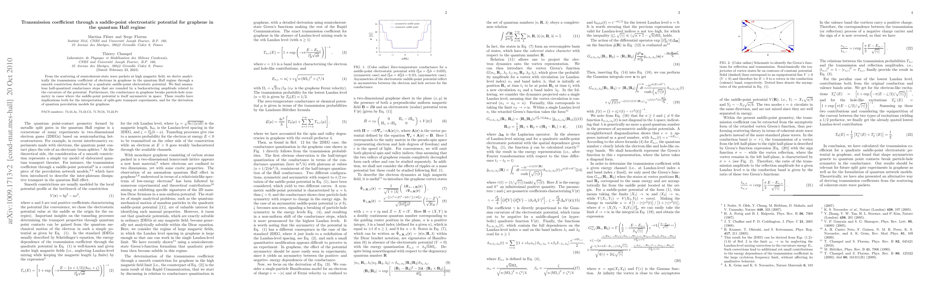 This paper analytically derives the transmission coefficient for electrons in graphene under high magnetic fields, revealing anomalous half-quantized conductance steps influenced by backscattering amplitude. It also discusses how asymmetric saddle-point potentials break particle-hole symmetry, impacting split-gate transport experiments and quantum percolation models.