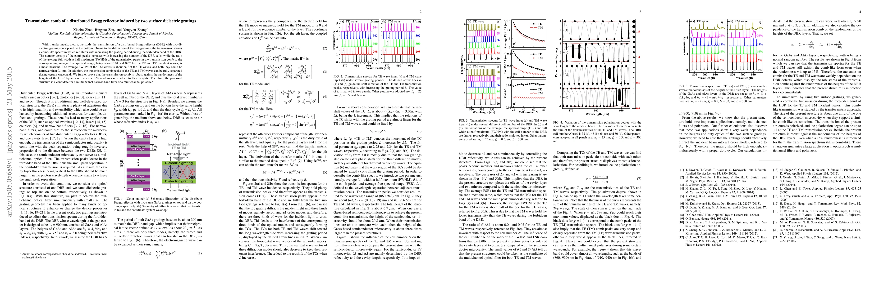 Researchers study a distributed Bragg reflector structure with two surface dielectric gratings, discovering a transmission comb spectrum that shifts red with increasing grating period and remains robust against layer height randomness.