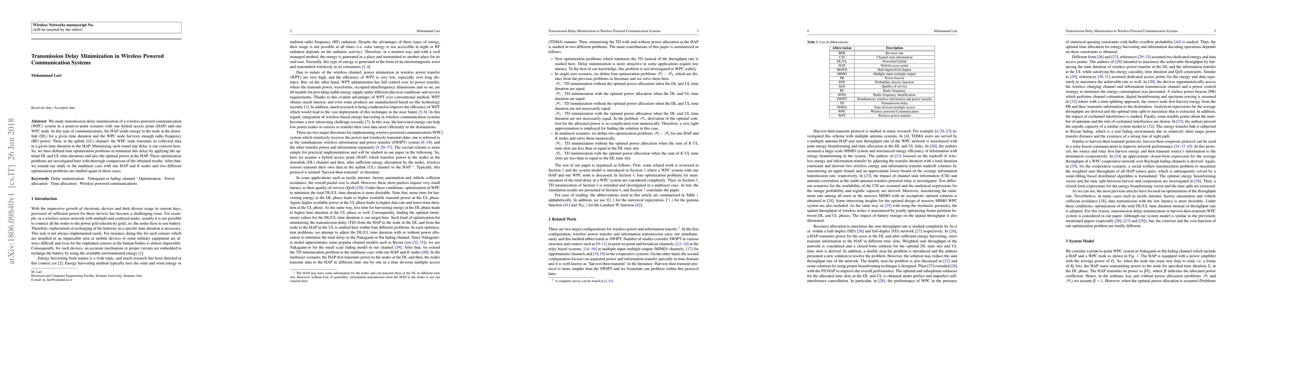 We study transmission delay minimization of a wireless powered communication (WPC) system in a point-to-point scenario with one hybrid access point (HAP) and one WPC node. In this type of communications, the HAP sends energy to the node at the downlink (DL) for a given time duration and the WPC node harvests enough radio frequency (RF) power. Then, at the uplink (UL) channel, the WPC node transmits its collected data in a given time duration to the HAP. Minimizing such round trip delay is our concern here. So, we have defined four optimization problems to minimize this delay by applying the optimal DL and UL time durations and also the optimal power at the HAP. These optimization problems are investigated here with thorough comparison of the obtained results. After that, we extend our study to the multiuser case with one HAP and $K$ nodes and two different optimization problems are studied again in these cases.