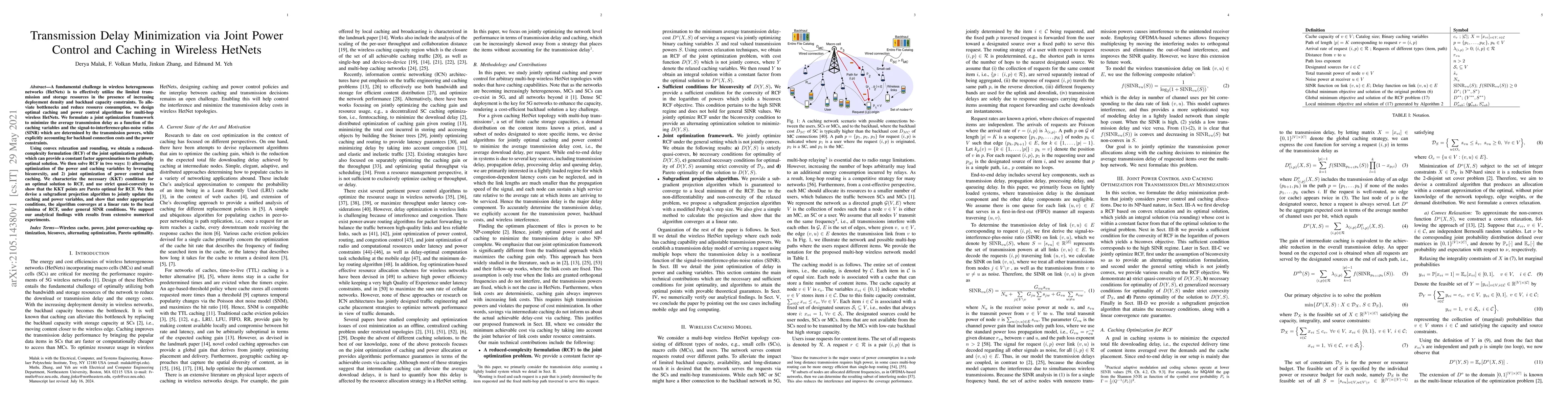This paper proposes optimal caching and power control algorithms to minimize transmission delay in wireless heterogeneous networks (HetNets), addressing resource constraints and backhaul limitations. The authors develop a joint optimization framework, solve it using reduced-complexity formulation, and demonstrate convergence of a subgradient projection algorithm through analytical and numerical experiments.