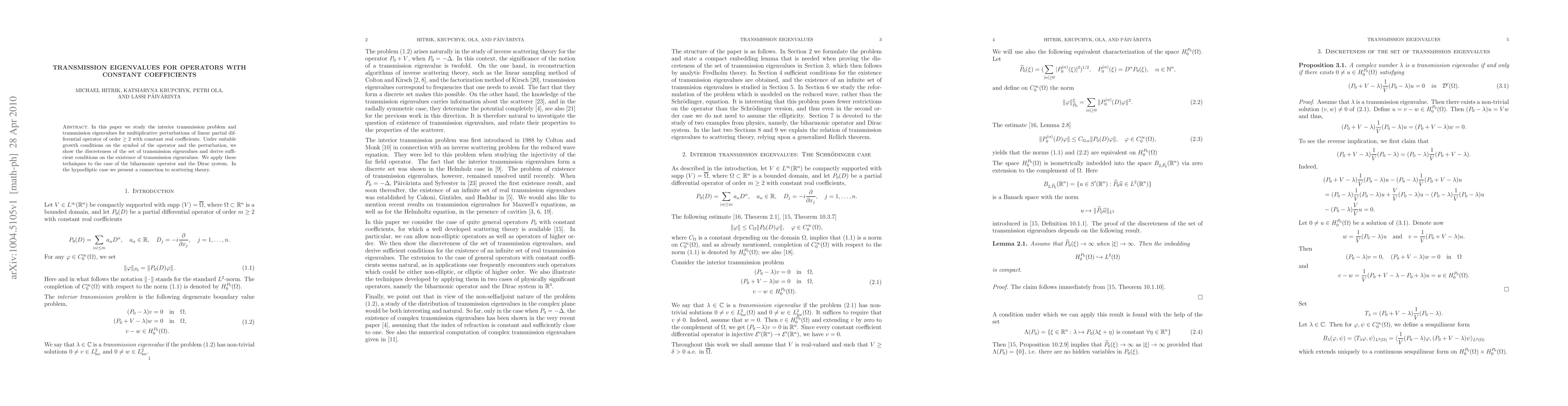 This paper investigates the interior transmission problem and transmission eigenvalues for linear partial differential operators of order ≥ 2 with constant coefficients under multiplicative perturbations. It demonstrates the discreteness of transmission eigenvalues and provides conditions for their existence, applying these findings to the biharmonic operator and the Dirac system, and linking the hypoelliptic case to scattering theory.