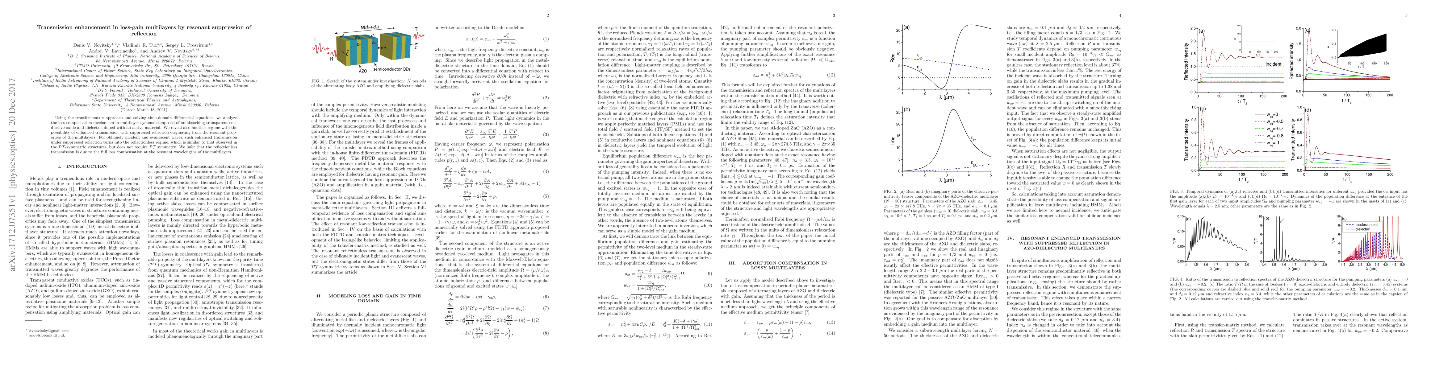 This paper investigates the enhanced transmission in multilayer systems through resonant suppression of reflection, revealing a reflectionless regime for obliquely incident and evanescent waves. The study uses the transfer-matrix approach to demonstrate that full loss compensation at resonant wavelengths achieves this effect without requiring PT symmetry.
