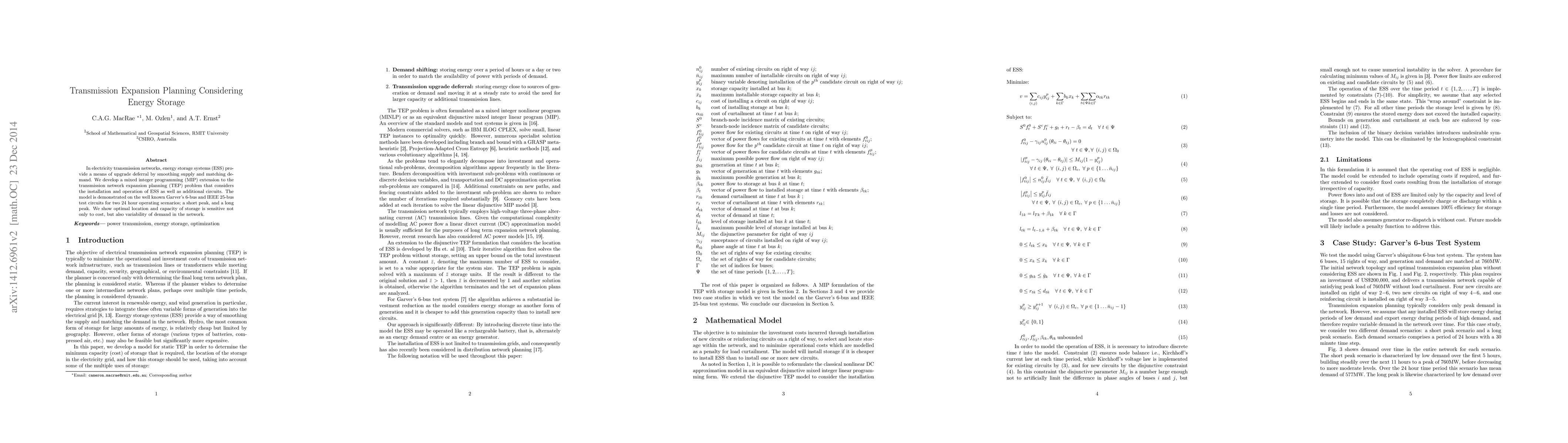 In electricity transmission networks, energy storage systems (ESS) provide a means of upgrade deferral by smoothing supply and matching demand. We develop a mixed integer programming (MIP) extension to the transmission network expansion planning (TEP) problem that considers the installation and operation of ESS as well as additional circuits. The model is demonstrated on the well known Garver's 6-bus and IEEE 25-bus test circuits for two 24 hour operating scenarios; a short peak, and a long peak. We show optimal location and capacity of storage is sensitive not only to cost, but also variability of demand in the network.