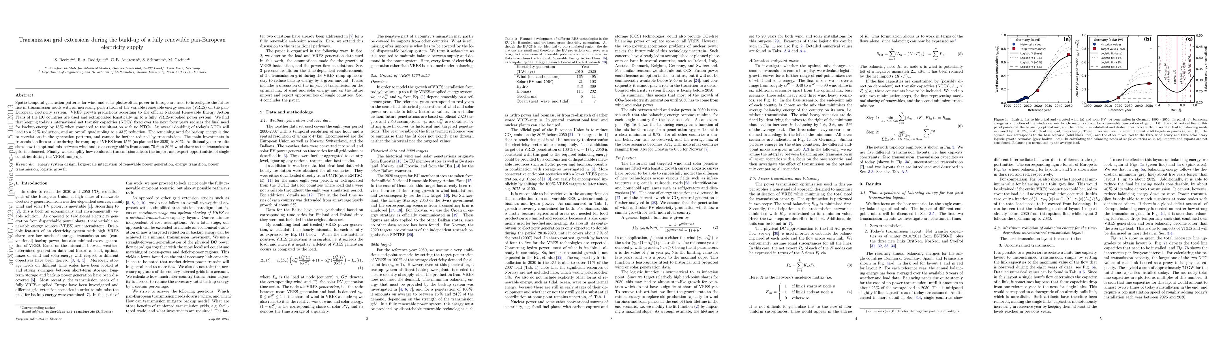 This paper investigates the future transmission grid extensions needed to accommodate the rise of wind and solar energy in Europe, finding that doubling or quadrupling current net transfer capacities can significantly reduce the need for backup energy. The optimal mix of renewable energy shifts towards more wind power as the grid improves.