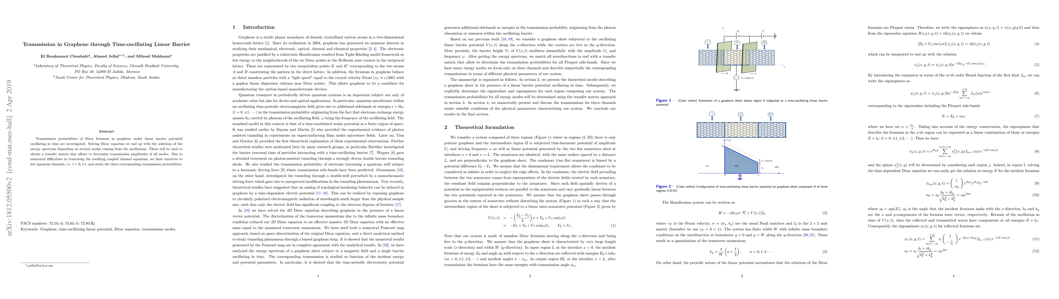 Transmission probabilities of Dirac fermions in graphene under linear barrier potential oscillating in time are investigated. Solving Dirac equation we end up with the solutions of the energy spectrum depending on several modes coming from the oscillations. These will be used to obtain a transfer matrix that allows to determine transmission amplitudes of all modes. Due to numerical difficulties in truncating the resulting coupled channel equations, we limit ourselves to low quantum channels, i.e. $l = 0, \pm1$, and study the three corresponding transmission probabilities.