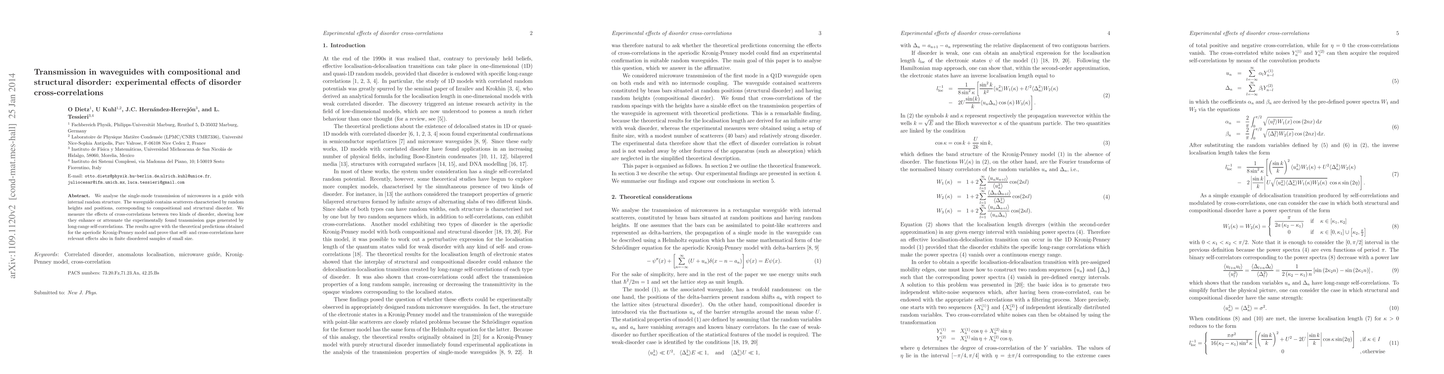 This paper investigates microwave transmission in waveguides with compositional and structural disorder, focusing on the impact of cross-correlations between different types of disorder. The study finds that these cross-correlations can either enhance or attenuate transmission gaps, effects that align with theoretical predictions from the aperiodic Kronig-Penney model.