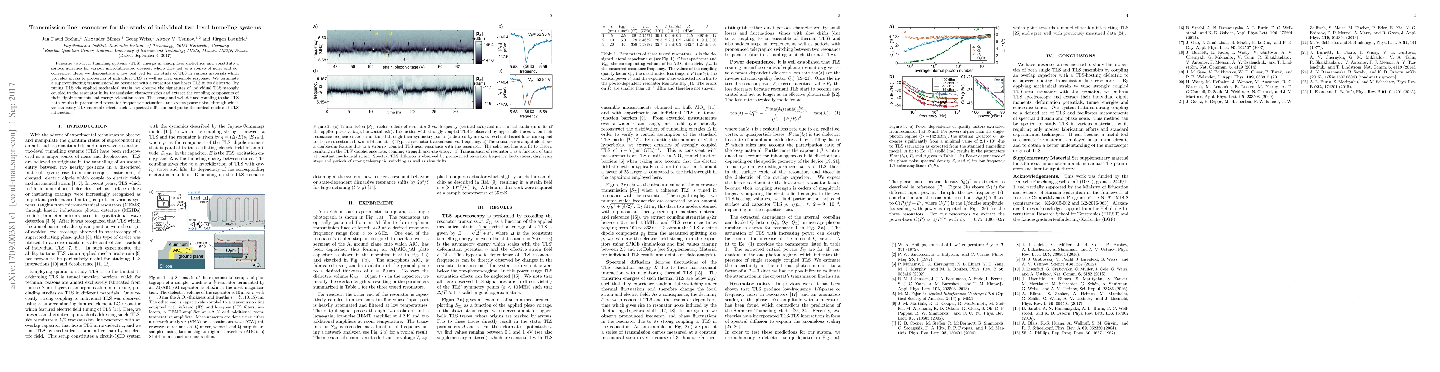 This paper presents a novel method using superconducting transmission-line resonators to study individual two-level tunneling systems (TLS) in dielectrics, observing their coupling and energy relaxation rates, and investigating ensemble effects like spectral diffusion. The method involves terminating a resonator with a capacitor containing TLS, which are tuned via mechanical strain.