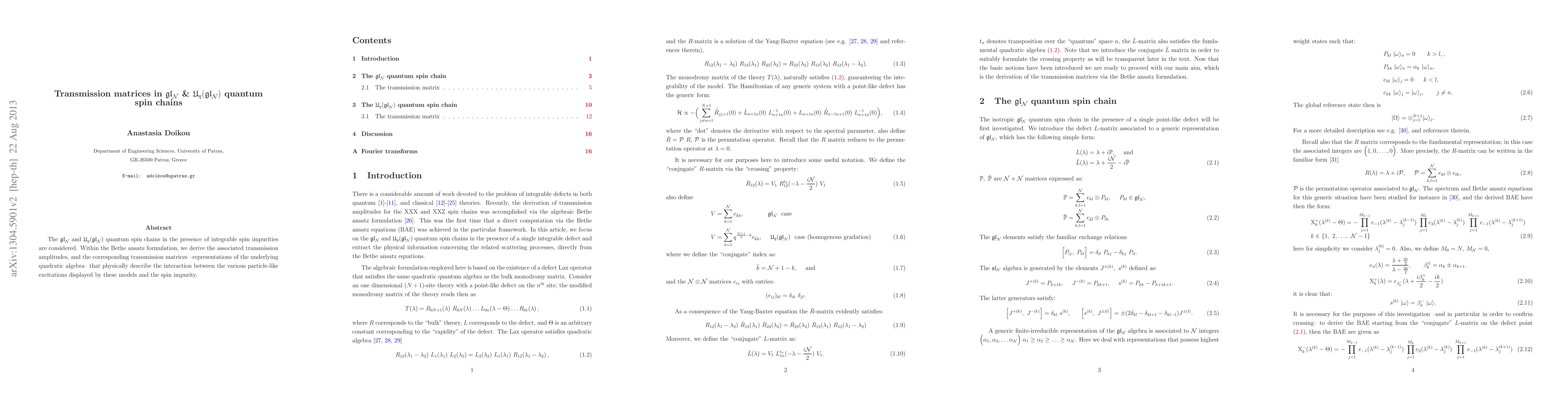 This paper derives transmission matrices for gl(N) and U_q(gl(N)) quantum spin chains with integrable spin impurities, using the Bethe ansatz to describe interactions between particle-like excitations and the impurities. These matrices represent the underlying quadratic algebra.