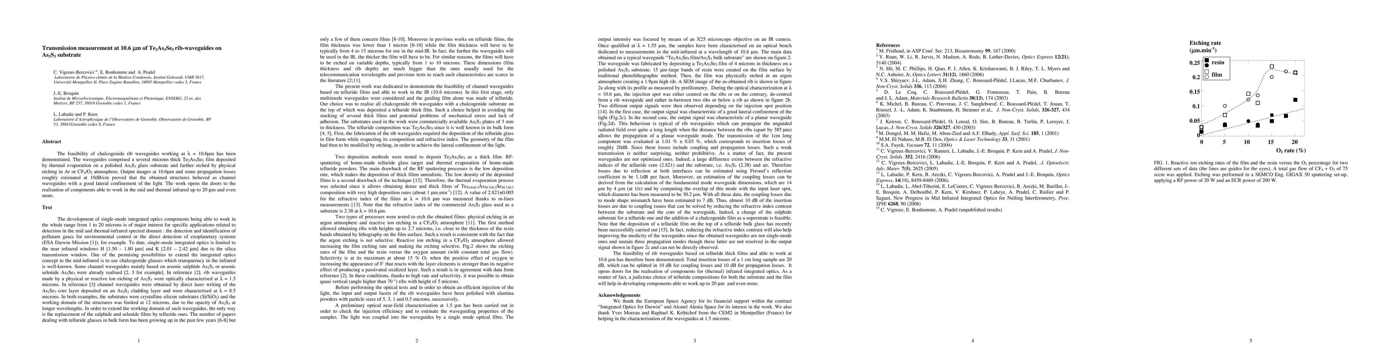 The feasibility of chalcogenide rib waveguides working at lambda = 10.6 microns has been demonstrated. The waveguides comprised a several microns thick Te2As3Se5 film deposited by thermal evaporation on a polished As2S3 glass substrate and further etched by physical etching in Ar or CF4/O2 atmosphere. Output images at 10.6 microns and some propagation losses roughly estimated at 10dB/cm proved that the obtained structures behaved as channel waveguides with a good lateral confinement of the light. The work opens the doors to the realisation of components able to work in the mid and thermal infrared up to 20 microns and even more.