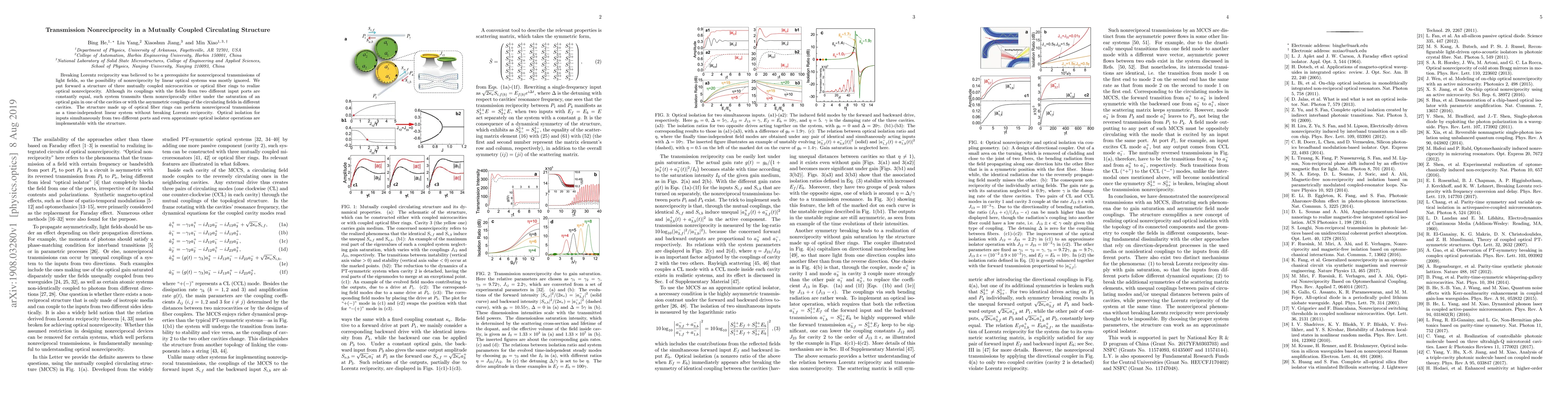 This paper proposes a three-cavity mutually coupled optical structure that achieves nonreciprocal light transmission without violating Lorentz reciprocity, demonstrating optical isolation and approximate isolator operations through optical gain saturation or asymmetric couplings.