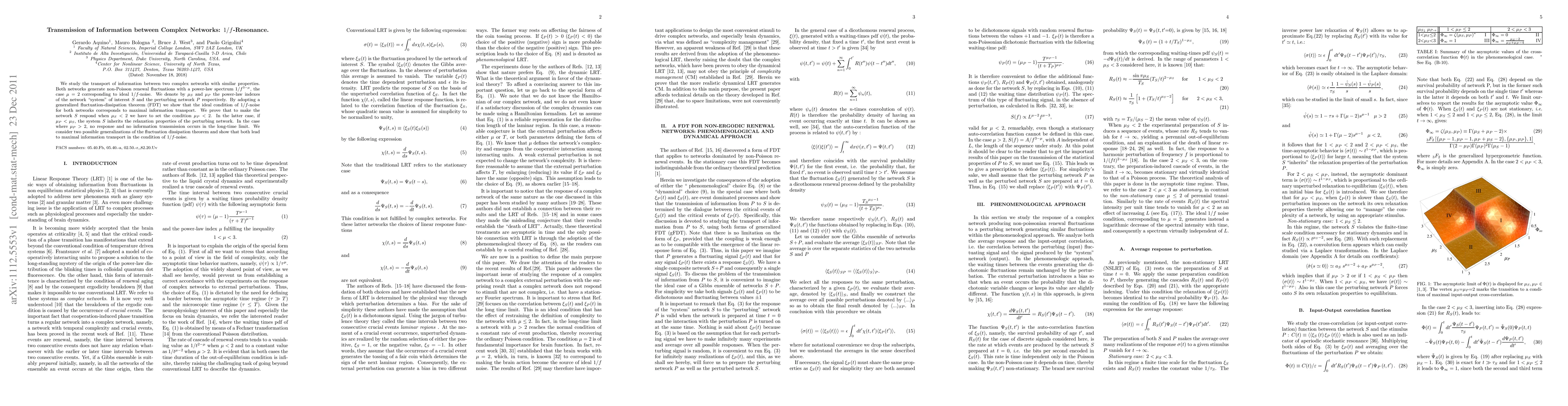 We study the transport of information between two complex networks with similar properties. Both networks generate non-Poisson renewal fluctuations with a power-law spectrum 1/f^(3-\mu), the case \mu= 2 corresponding to ideal 1/f-noise. We denote by \mu_S and \mu_P the power-law indexes of the network "system" of interest S and the perturbing network P respectively. By adopting a generalized fluctuation-dissipation theorem (FDT) we show that the ideal condition of 1/f-noise for both networks corresponds to maximal information transport. We prove that to make the network S respond when \mu_S < 2 we have to set the condition \mu_P < 2. In the latter case, if \mu_P < \mu_S, the system S inherits the relaxation properties of the perturbing network. In the case where \mu_P > 2, no response and no information transmission occurs in the long-time limit. We consider two possible generalizations of the fluctuation-dissipation theorem and show that both lead to maximal information transport in the condition of 1/f-noise.