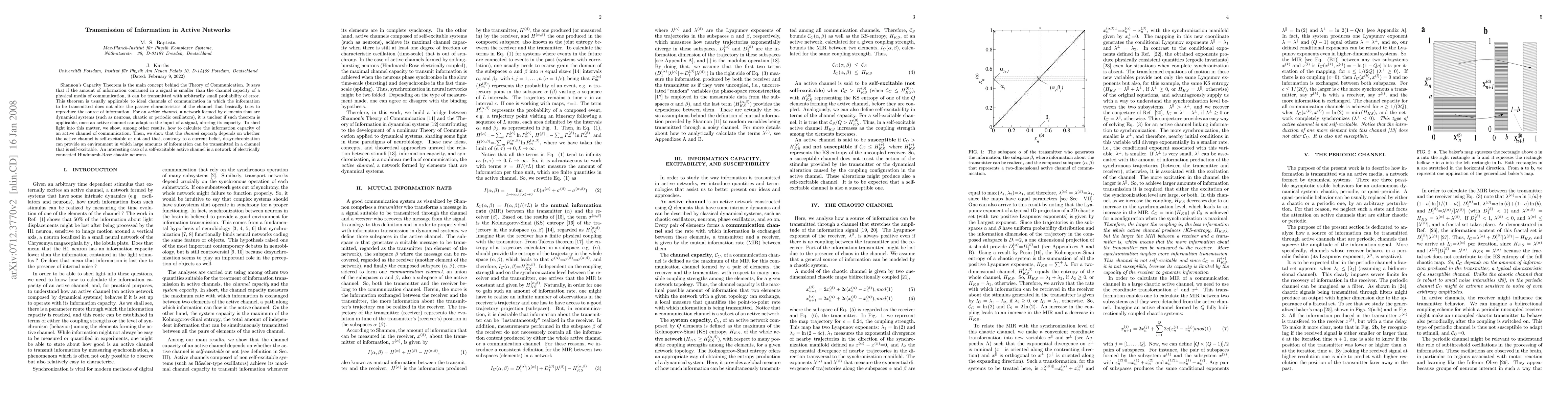Shannon's Capacity Theorem is the main concept behind the Theory of Communication. It says that if the amount of information contained in a signal is smaller than the channel capacity of a physical media of communication, it can be transmitted with arbitrarily small probability of error. This theorem is usually applicable to ideal channels of communication in which the information to be transmitted does not alter the passive characteristics of the channel that basically tries to reproduce the source of information. For an {\it active channel}, a network formed by elements that are dynamical systems (such as neurons, chaotic or periodic oscillators), it is unclear if such theorem is applicable, once an active channel can adapt to the input of a signal, altering its capacity. To shed light into this matter, we show, among other results, how to calculate the information capacity of an active channel of communication. Then, we show that the {\it channel capacity} depends on whether the active channel is self-excitable or not and that, contrary to a current belief, desynchronization can provide an environment in which large amounts of information can be transmitted in a channel that is self-excitable. An interesting case of a self-excitable active channel is a network of electrically connected Hindmarsh-Rose chaotic neurons.