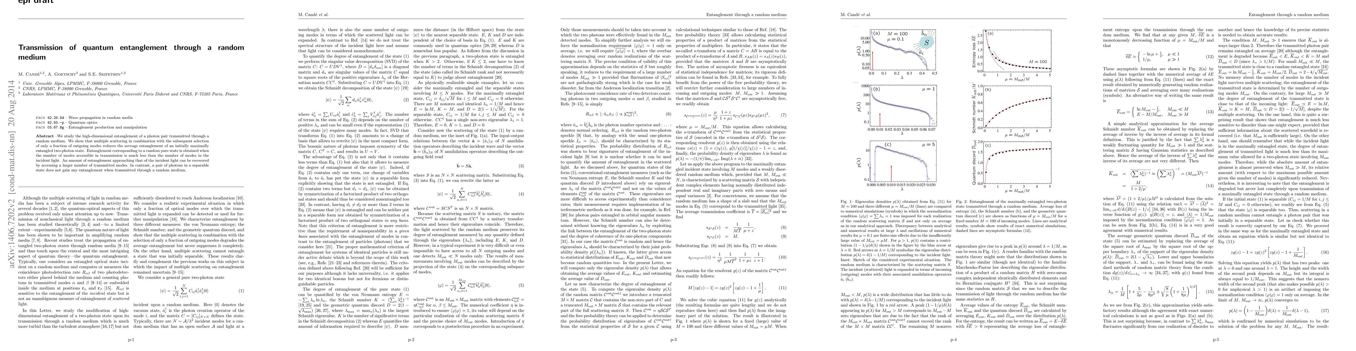 This study investigates the transmission of high-dimensional quantum entanglement through a random medium, revealing that multiple scattering reduces initial entanglement. The recovery of entanglement is possible by selecting a larger number of transmitted modes, while separable photon pairs remain unaffected.