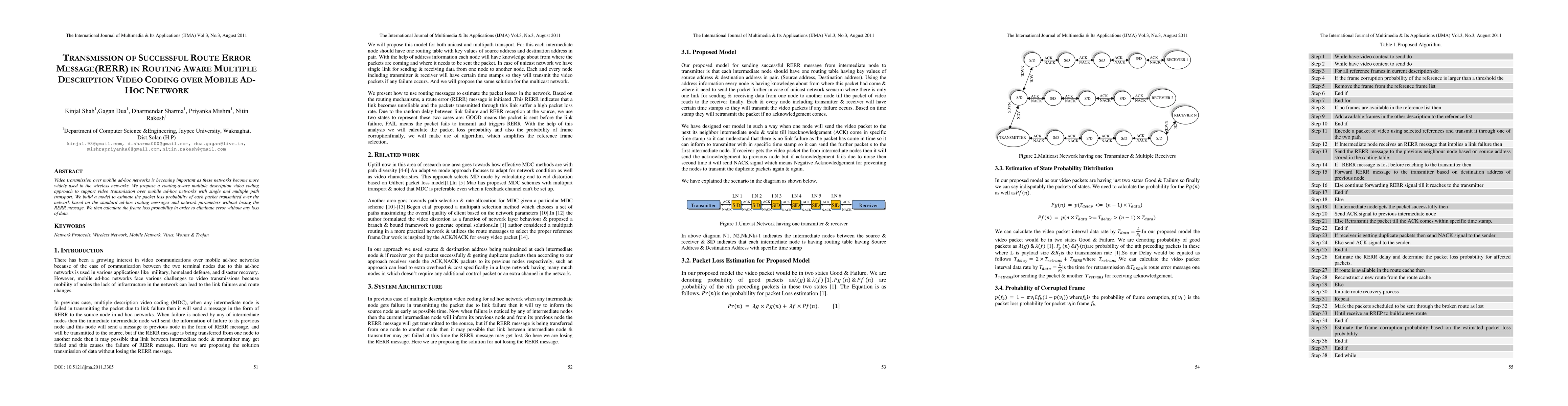 Video transmission over mobile ad-hoc networks is becoming important as these networks become more widely used in the wireless networks. We propose a routing-aware multiple description video coding approach to support video transmission over mobile ad-hoc networks with single and multiple path transport. We build a model to estimate the packet loss probability of each packet transmitted over the network based on the standard ad-hoc routing messages and network parameters without losing the RERR message. We then calculate the frame loss probability in order to eliminate error without any loss of data.