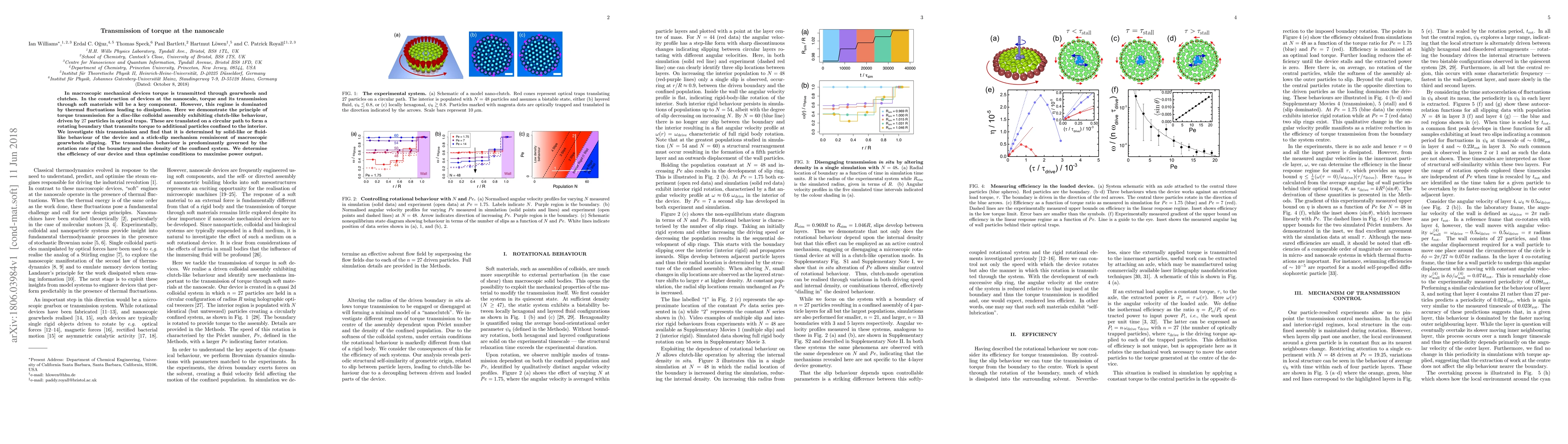 This research demonstrates torque transmission in a nanoscale colloidal assembly, mimicking macroscopic gearwheels. The transmission is governed by the assembly's solid-like or fluid-like behavior and a stick-slip mechanism, with efficiency optimized by rotation rate and confinement density.