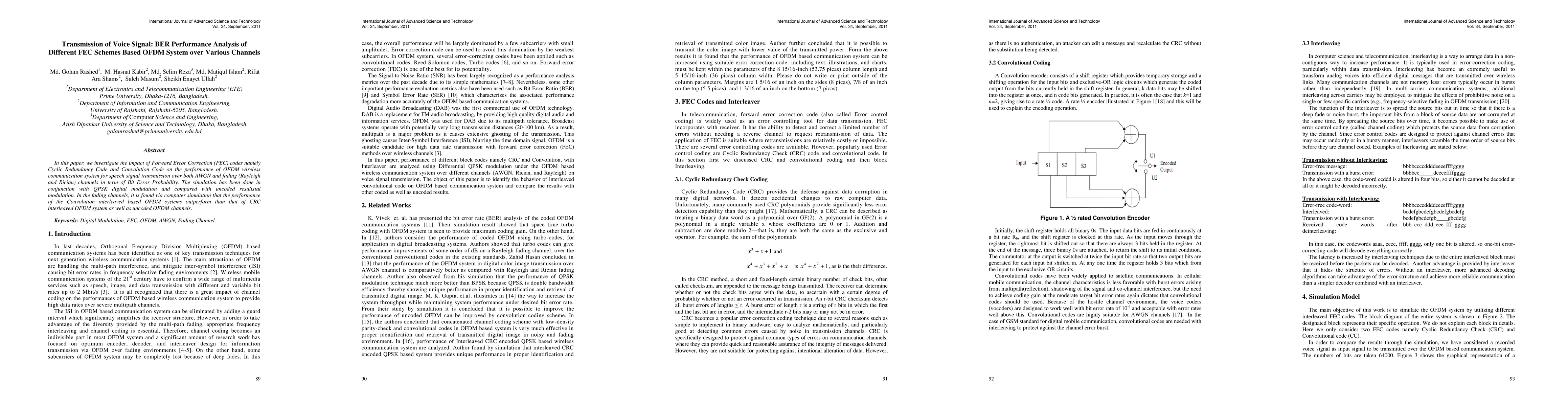 This paper analyzes the performance of OFDM systems using Cyclic Redundancy Code (CRC) and Convolution Code for speech signal transmission over AWGN, Rayleigh, and Rician channels, focusing on Bit Error Rate (BER). Convolution interleaved OFDM systems show superior performance in fading channels compared to CRC interleaved and uncoded systems.