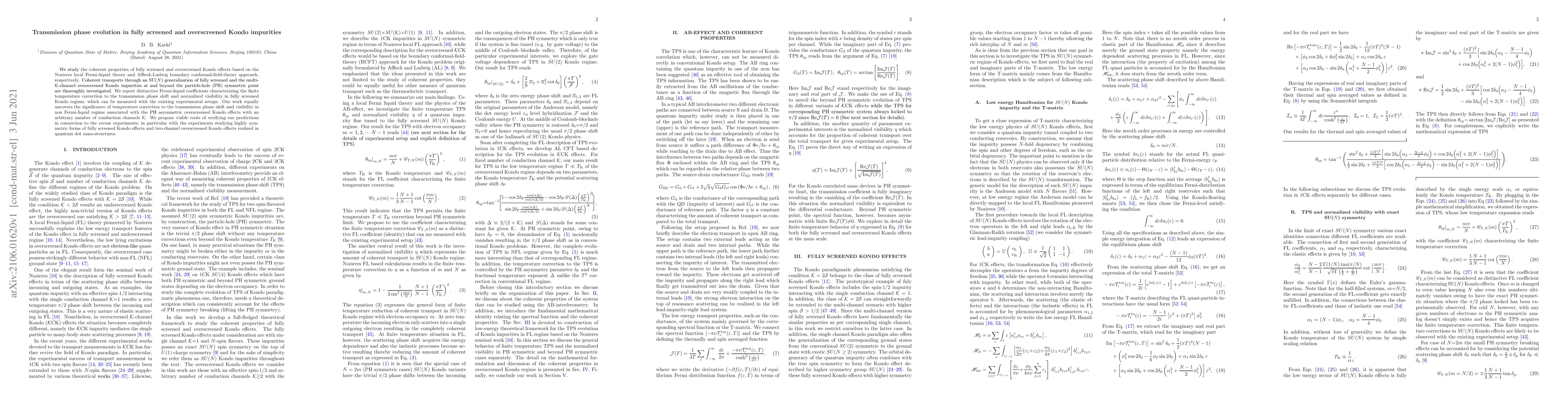 We study the coherent properties of fully screened and overscreened Kondo effects based on the Nozieres local Fermi-liquid theory and Affleck-Ludwig boundary conformal-field-theory approach, respectively. Coherent transports through an SU($N)$ generalization of fully screened and the multi-$\mathcal{K}$-channel overscreened Kondo impurities at and beyond the particle-hole (PH) symmetric point are thoroughly investigated. We report distinctive Fermi-liquid coefficients characterizing the finite temperature correction to the transmission phase shift and normalized visibility in fully screened Kondo regime, which can be measured with the existing experimental setups. Our work equally uncovers the significance of temperature correction to the transmission phase shift and visibility in non Fermi-liquid regime associated with the PH asymmetric overscreened Kondo effects with an arbitrary number of conduction channels $\mathcal{K}$. We propose viable roots of verifying our predictions in connection to the recent experiments, in particular with the experiments studying highly symmetric forms of fully screened Kondo effects and two-channel overscreened Kondo effects realized in quantum dot nano-structures.