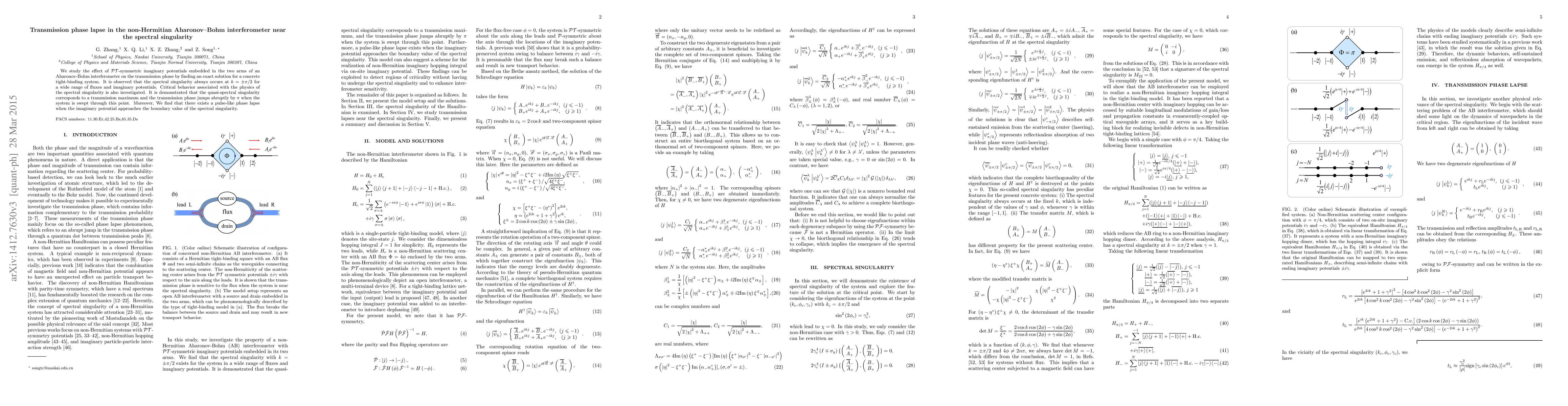 This paper investigates the transmission phase in a PT-symmetric Aharonov-Bohm interferometer, revealing a spectral singularity at k=±π/2. It demonstrates a phase jump of π and a pulse-like phase lapse near the singularity boundary, highlighting critical behavior linked to the spectral singularity.