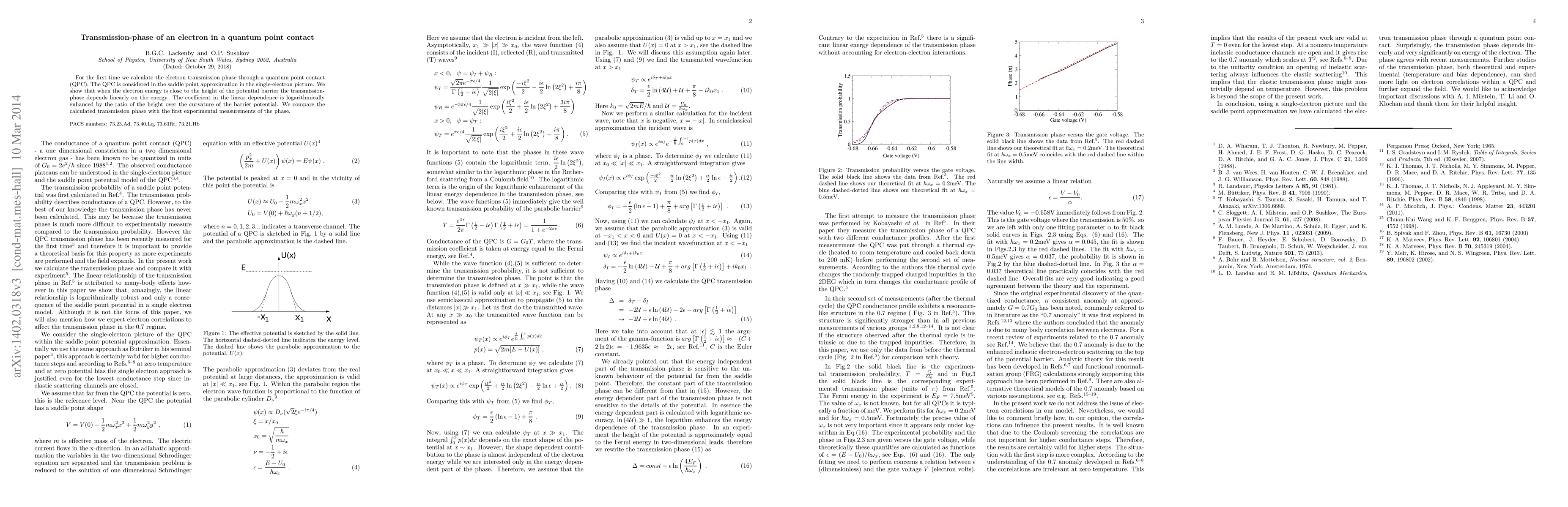 This research calculates the electron transmission phase through a quantum point contact (QPC) using saddle point approximation in single-electron picture. It finds the phase depends linearly on electron energy near barrier height, with a logarithmically enhanced coefficient based on barrier height and curvature, and compares these calculations to initial experimental measurements of the phase.