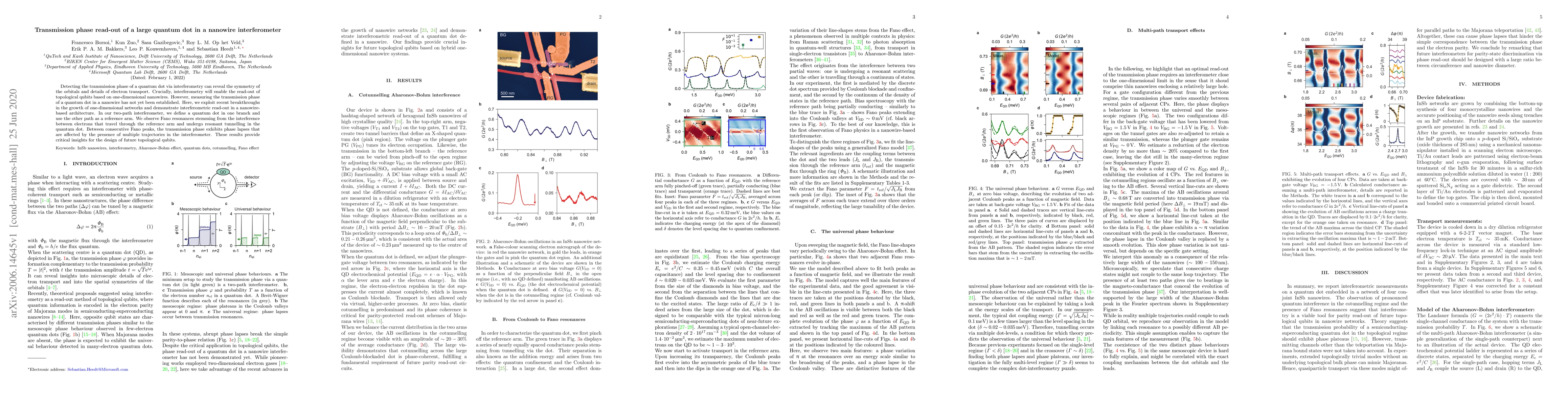 This paper demonstrates the interferometric read-out of the transmission phase of a quantum dot in a nanowire interferometer, revealing insights into electron transport and orbital symmetry. The observed Fano resonances and phase lapses provide crucial data for the development of topological qubits based on one-dimensional nanowires.