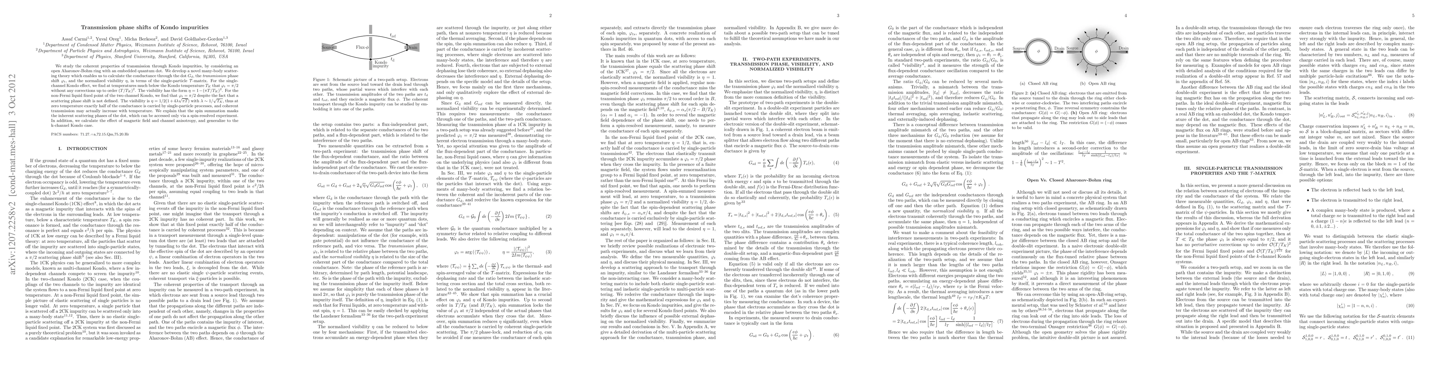 This paper develops a new many-body scattering theory to analyze transmission through Kondo impurities in an open Aharonov-Bohm ring with a quantum dot. It reveals that the transmission phase shift is π/2 for single-channel Kondo effect at low temperatures, with visibility dependent on temperature, and shows that spin summation masks scattering phases, which can be revealed through spin-resolved experiments.