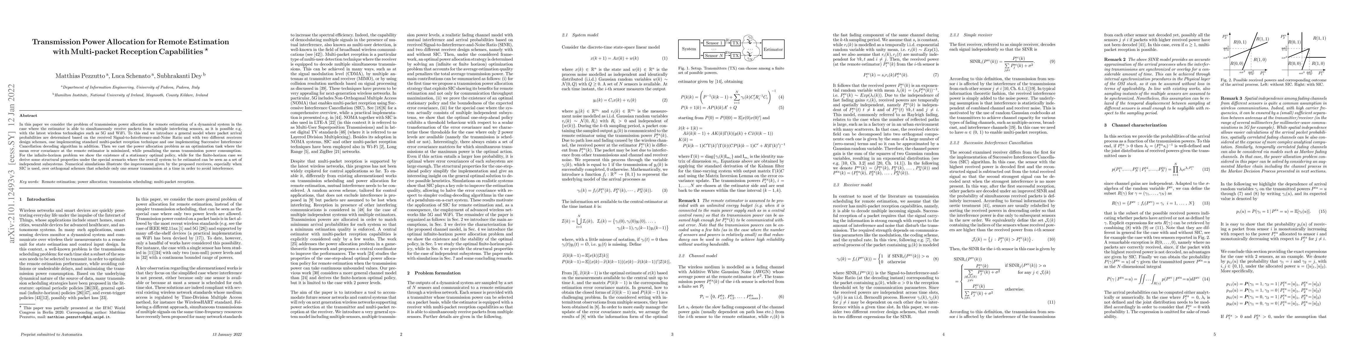 In this paper we consider the problem of transmission power allocation for remote estimation of a dynamical system in the case where the estimator is able to simultaneously receive packets from multiple interfering sensors, as it is possible e.g. with the latest wireless technologies such as 5G and WiFi. To this end we introduce a general model where packet arrival probabilities are determined based on the received Signal-to-Interference-and-Noise Ratio and with two different receivers design schemes, one implementing standard multi-packet reception technique and one implementing Successive Interference Cancellation decoding algorithm in addition. Then we cast the power allocation problem as an optimization task where the mean error covariance at the remote estimator is minimized, while penalizing the mean transmission power consumption. For the infinite-horizon problem we show the existence of a stationary optimal policy, while for the finite-horizon case we derive some structural properties under the special scenario where the overall system to be estimated can be seen as a set of independent subsystems. Numerical simulations illustrate the improvement given by the proposed receivers over orthogonal schemes that schedules only one sensor transmission at a time in order to avoid interference.