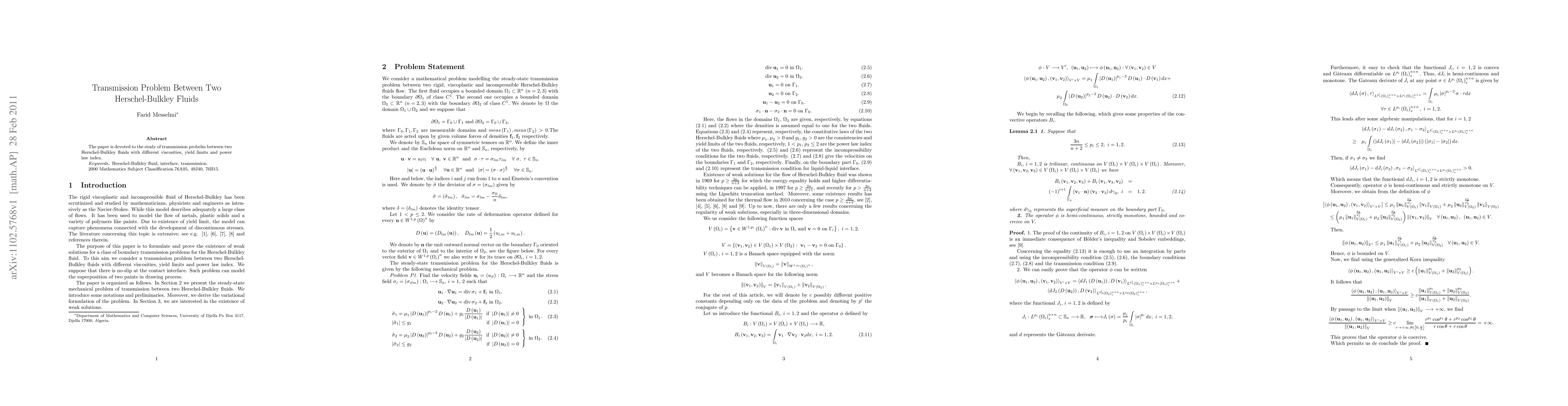Summary: This paper investigates the transmission dynamics between two Herschel-Bulkley fluids characterized by varying viscosities, yield limits, and power law indices, aiming to understand their interaction and flow behavior.