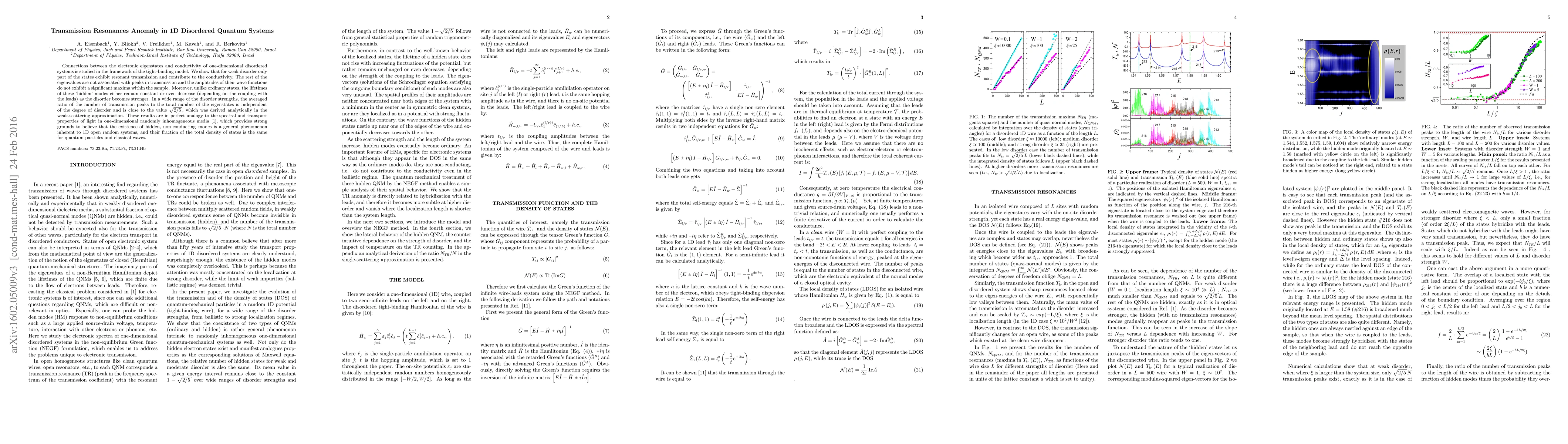 Connections between the electron eigenstates and conductivity of one-dimensional disordered electron systems is studied in the framework of the tight-binding model. We show that for weak disorder only part of the states exhibit resonant transmission and contribute to the conductivity. The rest of the eigenvalues are not associated with peaks in transmission and the amplitudes of their wave functions do not exhibit a significant maxima within the sample. Moreover, unlike ordinary states, the lifetimes of these `hidden' modes either remain constant or even decrease (depending on the coupling with the leads) as the disorder becomes stronger. In a wide range of the disorder strengths, the averaged ratio of the number of transmission peaks to the total number of the eigenstates is independent of the degree of disorder and is close to the value $\sqrt{2/5}$, which was derived analytically in the weak-scattering approximation. These results are in perfect analogy to the spectral and transport properties of light in one-dimensional randomly inhomogeneous media, which provides strong grounds to believe that the existence of hidden, non-conducting modes is a general phenomenon inherent to 1D open random systems, and their fraction of the total density of states is the same for quantum particles and classical waves.