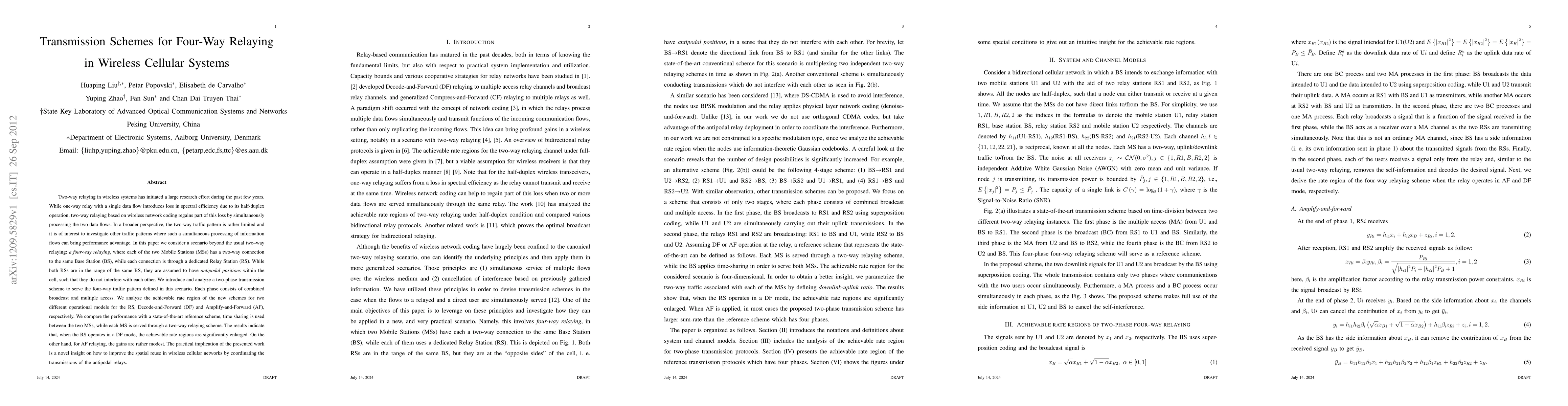This paper investigates a four-way relaying scenario in wireless cellular systems, introducing a two-phase transmission scheme to enhance spectral efficiency. It compares the performance of Decode-and-Forward and Amplify-and-Forward relaying modes, finding significant rate region improvements with DF mode, while AF mode yields modest gains.