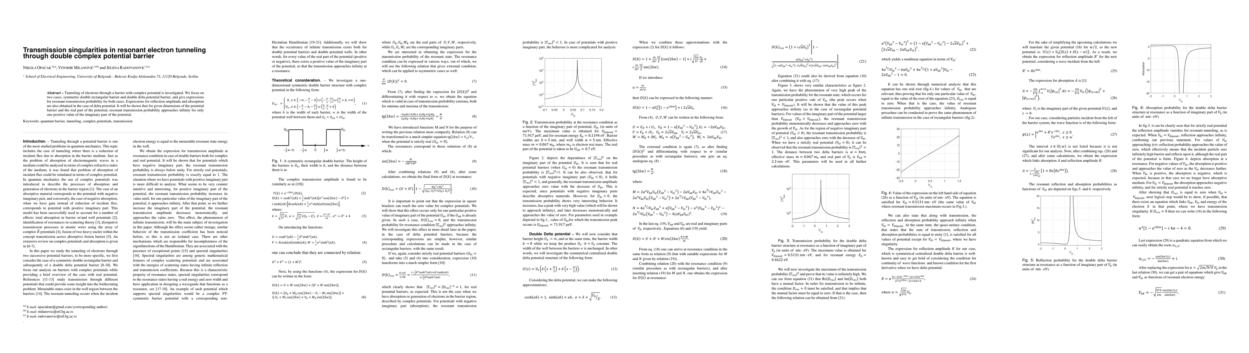 This paper investigates electron tunneling through complex potential barriers, deriving expressions for resonant transmission probability in symmetric double rectangular and double delta potential cases. It reveals that for specific barrier dimensions and real potential parts, the transmission probability becomes infinite at a unique positive imaginary potential value.