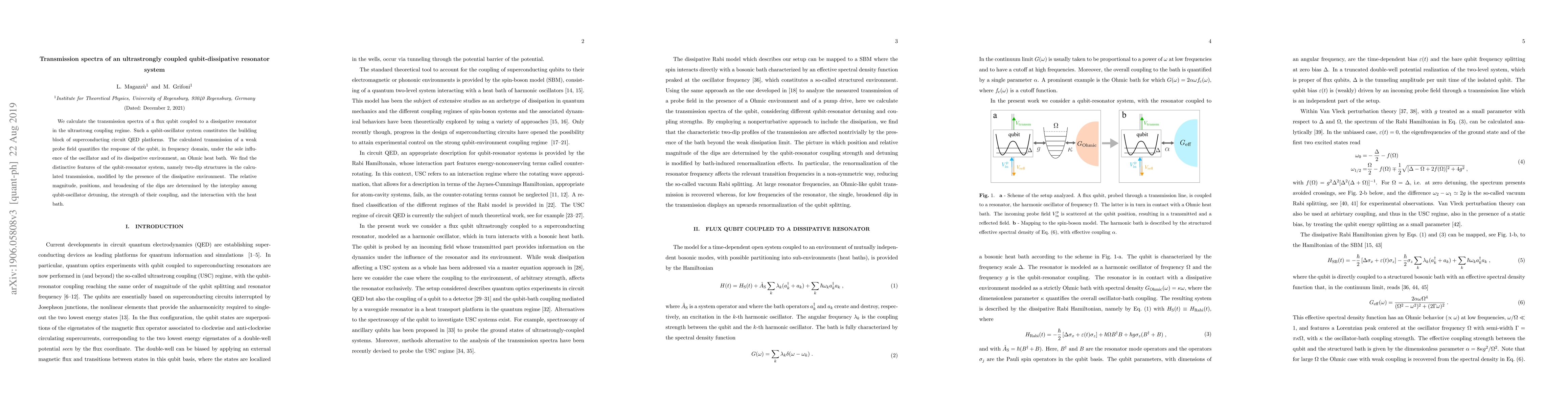 This paper investigates the transmission spectra of an ultrastrongly coupled qubit-dissipative resonator system, revealing two-dip structures influenced by the qubit-oscillator detuning, coupling strength, and interaction with an Ohmic heat bath. The findings highlight the unique response characteristics of such systems in superconducting circuit QED platforms.