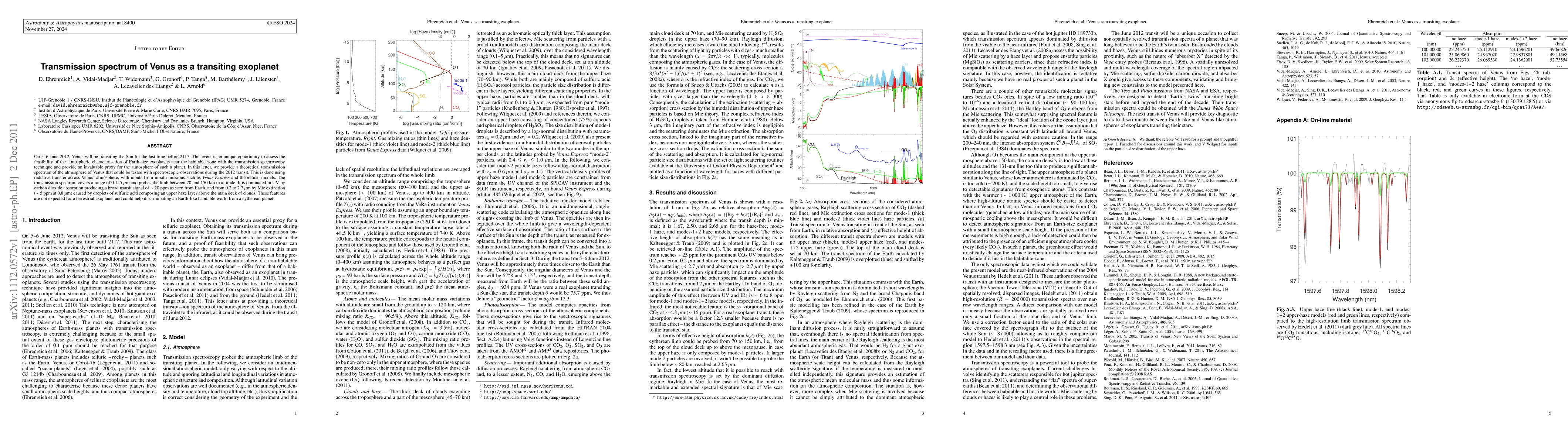 This paper presents a theoretical transmission spectrum of Venus during its 2012 transit, simulating the atmospheric characterization of Earth-size exoplanets using spectroscopic observations. The spectrum, covering 0.1-5 μm, highlights unique features like CO2 absorption and sulfuric acid haze, aiding in distinguishing Earth-like planets from Venus-like analogs.