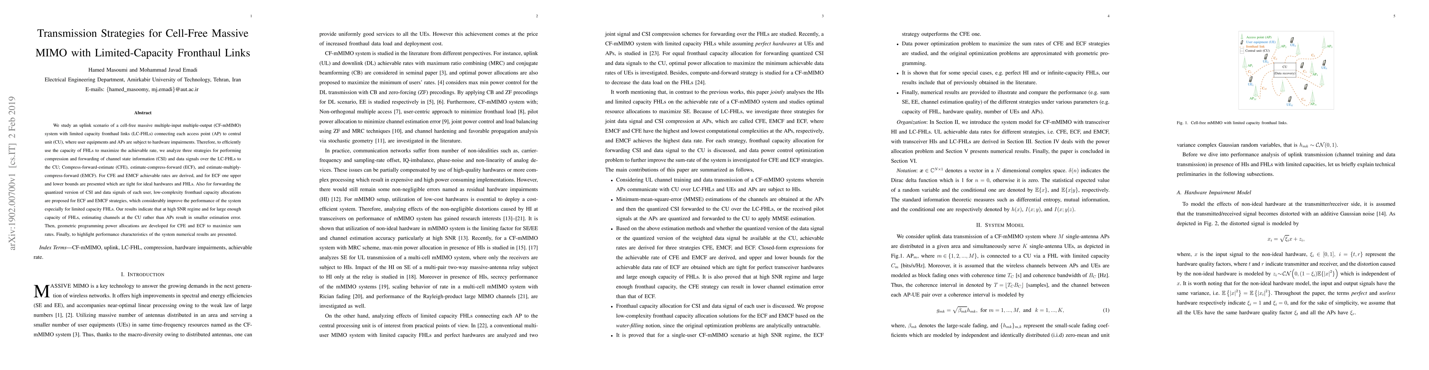We study an uplink scenario of a cell-free massive multiple-input multiple-output (CF-mMIMO) system with limited capacity fronthaul links (LC-FHLs) connecting each access point (AP) to the central unit (CU), where user equipments and APs are subject to hardware impairments. Therefore, to efficiently use the capacity of FHLs to maximize the achievable rate, we analyze three strategies for performing compression and forwarding of channel state information (CSI) and data signals over the LC-FHLs to the CU; Compress-forward-estimate (CFE), estimate-compress-forward (ECF), and estimate-multiply-compress-forward (EMCF). For CFE and EMCF achievable rates are derived, and for ECF one upper and lower bounds are presented which are tight for ideal hardware and FHLs. Also for forwarding the quantized version of CSI and data signals of each user, low-complexity fronthaul capacity allocations are proposed for ECF and EMCF strategies, which considerably improve the performance of the system, especially for limited capacity FHLs. Our results indicate that at high SNR regime and for large enough capacity of FHLs, estimating channels at the CU rather than APs result in smaller estimation error. Then, geometric programming power allocations are developed for CFE and ECF to maximize sum rates. Finally, to highlight the performance characteristics of the system numerical results are presented.