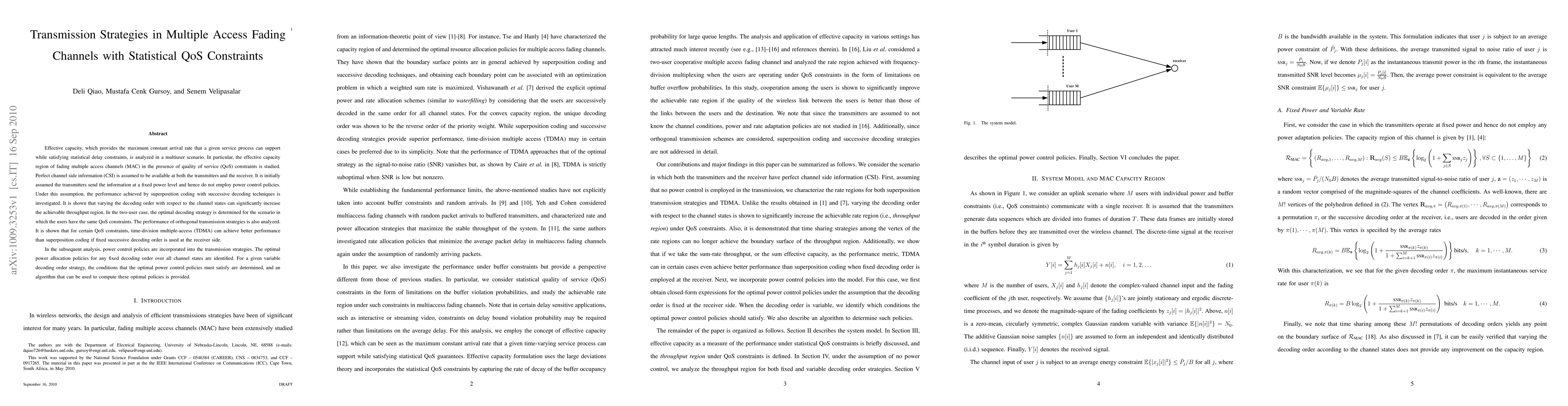 This paper analyzes effective capacity in multiple access fading channels under statistical QoS constraints, focusing on superposition coding and successive decoding. It finds that varying decoding order can enhance throughput, and for two users with identical QoS, TDMA may outperform superposition coding under certain conditions. The study also incorporates power control, identifying optimal power allocation policies and providing an algorithm for computing them.