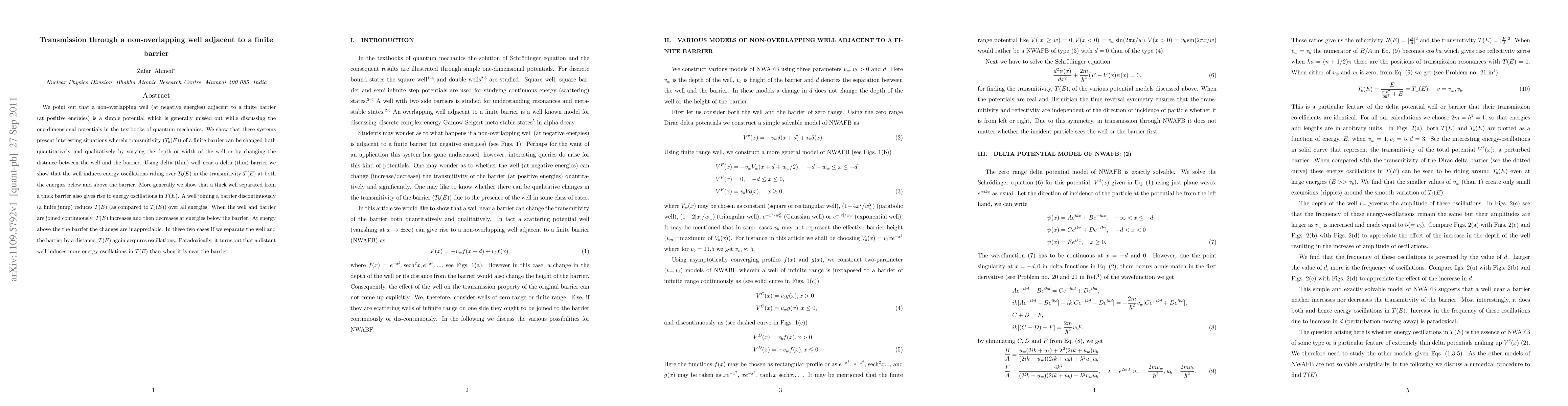 This research paper investigates how a non-overlapping well near a finite barrier affects transmitivity, showing that varying the well's depth or width can alter energy oscillations in transmitivity at energies below and above the barrier.