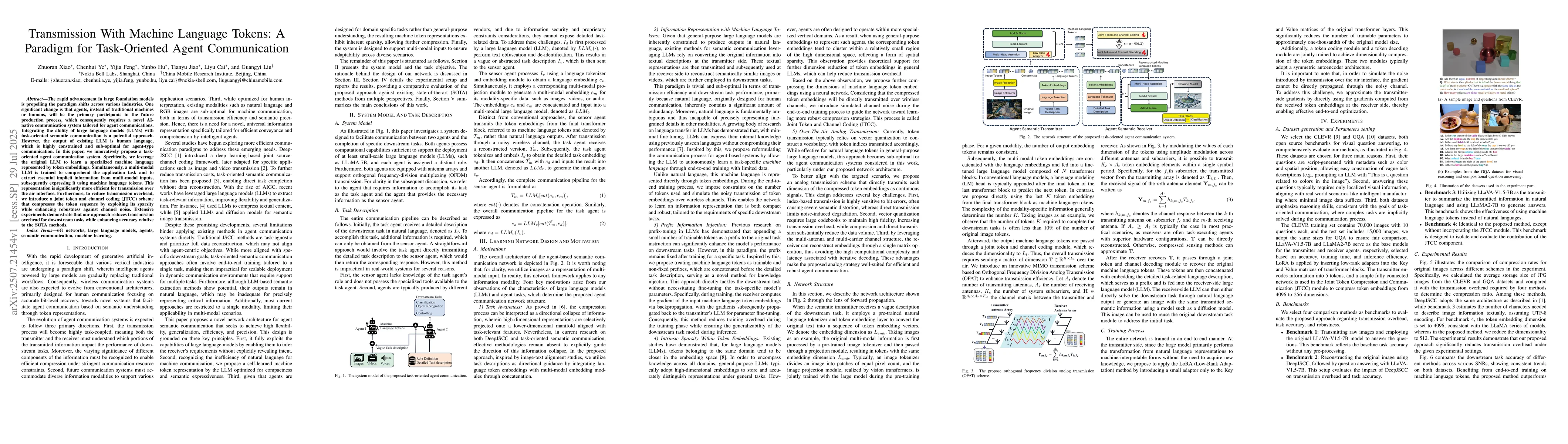 The rapid advancement in large foundation models is propelling the paradigm shifts across various industries. One significant change is that agents, instead of traditional machines or humans, will be the primary participants in the future production process, which consequently requires a novel AI-native communication system tailored for agent communications. Integrating the ability of large language models (LLMs) with task-oriented semantic communication is a potential approach. However, the output of existing LLM is human language, which is highly constrained and sub-optimal for agent-type communication. In this paper, we innovatively propose a task-oriented agent communication system. Specifically, we leverage the original LLM to learn a specialized machine language represented by token embeddings. Simultaneously, a multi-modal LLM is trained to comprehend the application task and to extract essential implicit information from multi-modal inputs, subsequently expressing it using machine language tokens. This representation is significantly more efficient for transmission over the air interface. Furthermore, to reduce transmission overhead, we introduce a joint token and channel coding (JTCC) scheme that compresses the token sequence by exploiting its sparsity while enhancing robustness against channel noise. Extensive experiments demonstrate that our approach reduces transmission overhead for downstream tasks while enhancing accuracy relative to the SOTA methods.
