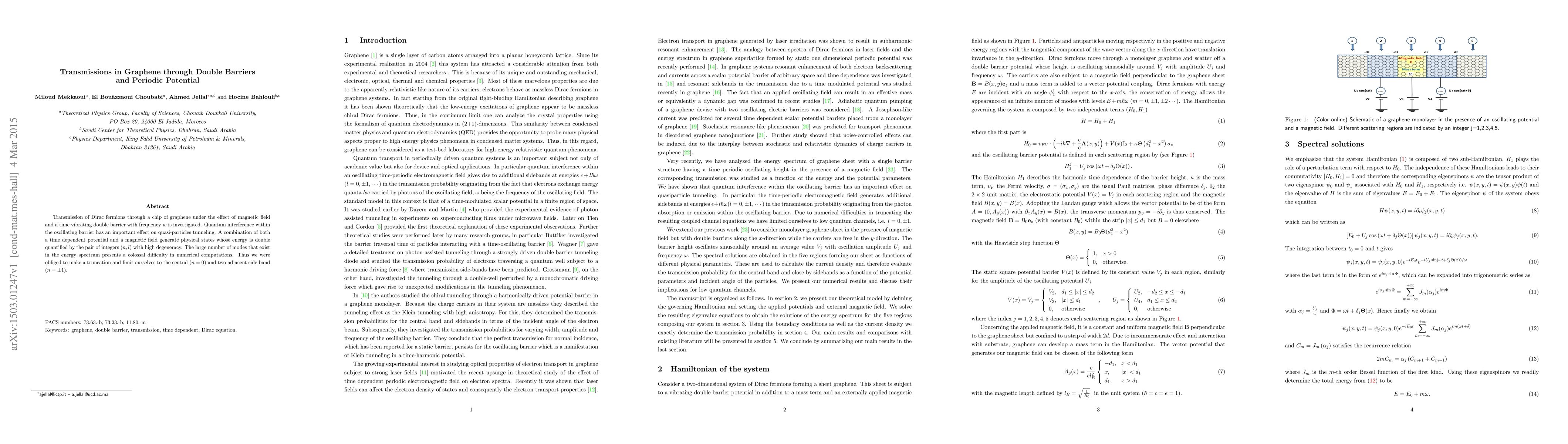 This paper investigates the transmission of Dirac fermions in graphene under a magnetic field and a time-varying double barrier, highlighting the impact of quantum interference on quasi-particle tunneling. The study focuses on the energy states doubly quantified by integers $(n, l)$, with a particular analysis on the central and two adjacent modes due to computational challenges.